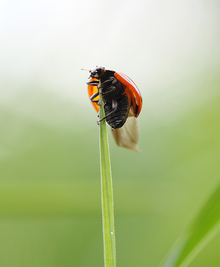 Та коровка не мычала, И копытом не стучала, И рогами не трясла, А по пальцу вверх ползла И с него, помедля малость, Прямо в небо подымалась...)