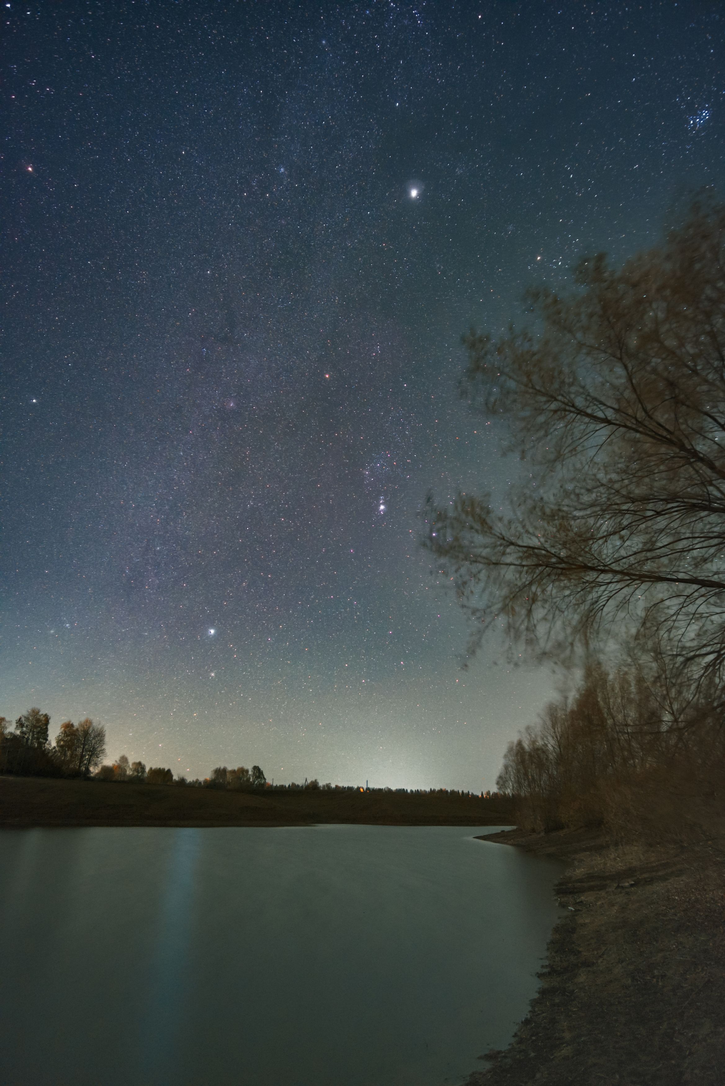 Осеннее звёздное небо после заката луны, снято рано утром 15 октября. Отражения на воде не получились из за ветра. Один лишь Сириус отсвечивался хорошо.