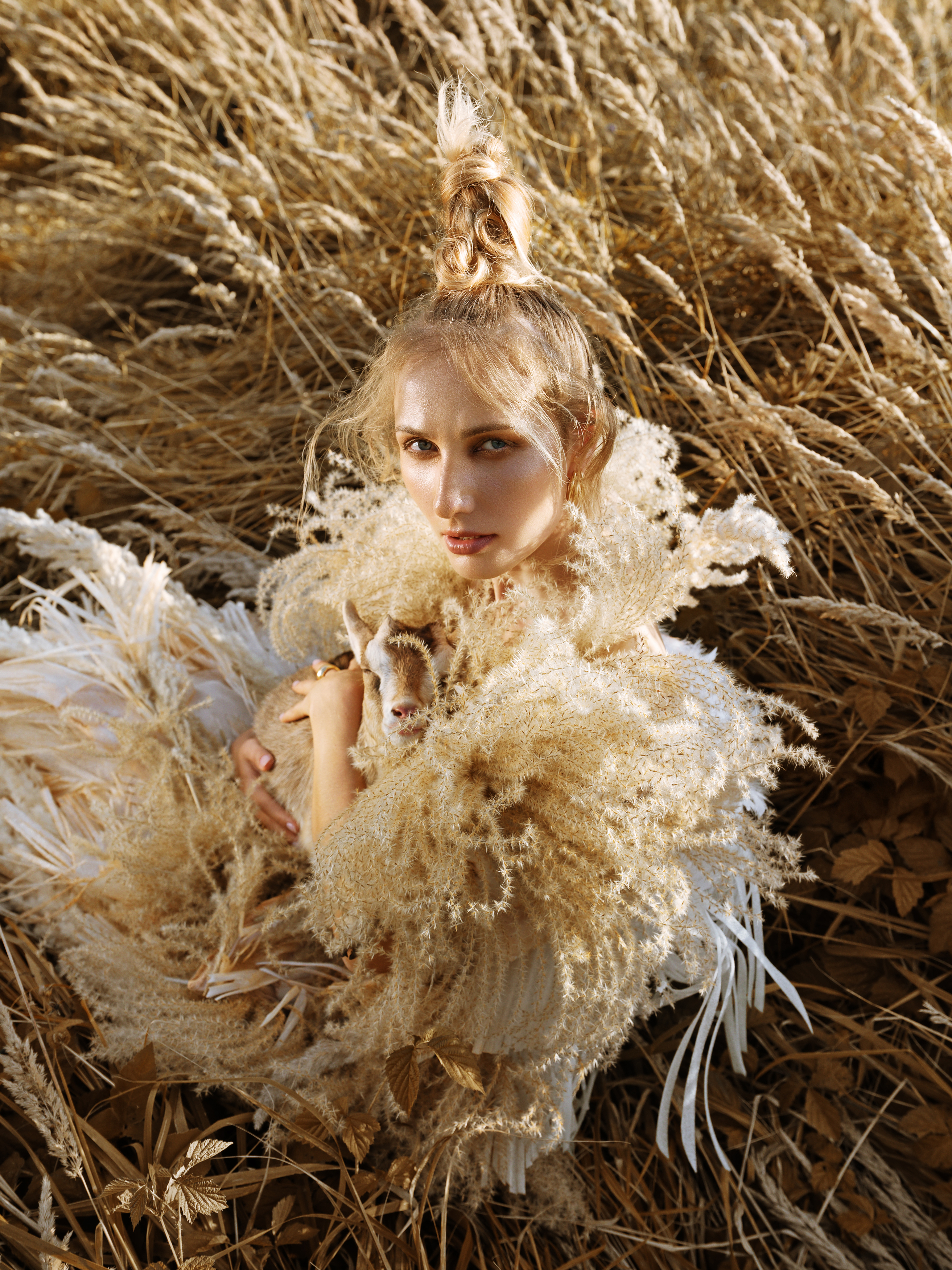 Свет мягкий, естественный, хорошо передаёт текстуру сухой травы и тонкую фактуру наряда. Композиция выстроена гармонично — фигура в центре, фон не перегружен, акцент на деталях. Выбор цветовой гаммы — тёплые золотистые оттенки — усиливает ощущение уюта и единства с природой.