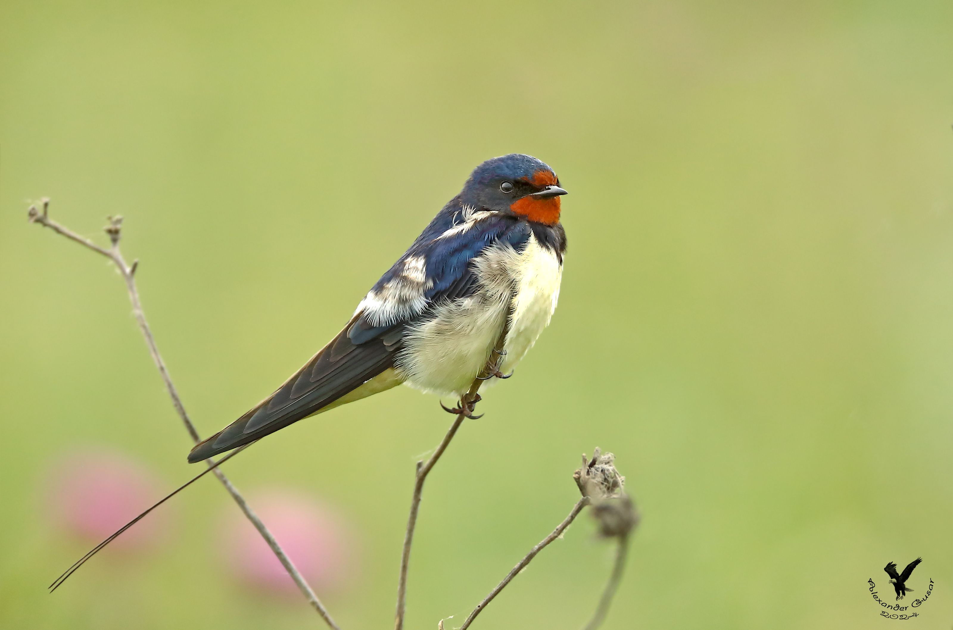 Деревенская ласточка - небольшая птица, длина тела 14,6—23 см, размах крыльев 31,8—35 см. Масса птицы составляет 17—24 грамм. Окраска сверху — сине-чёрная с металлическим отблеском, снизу бледно-бежевая. На лбу и передней части шеи имеются светло-коричневые пятна. Хвост длинный, с глубоким вырезом посередине. Самцы и самки выглядят приблизительно одинаково, хотя самки часто окрашены чуть менее контрастно, и их хвост чуть короче.