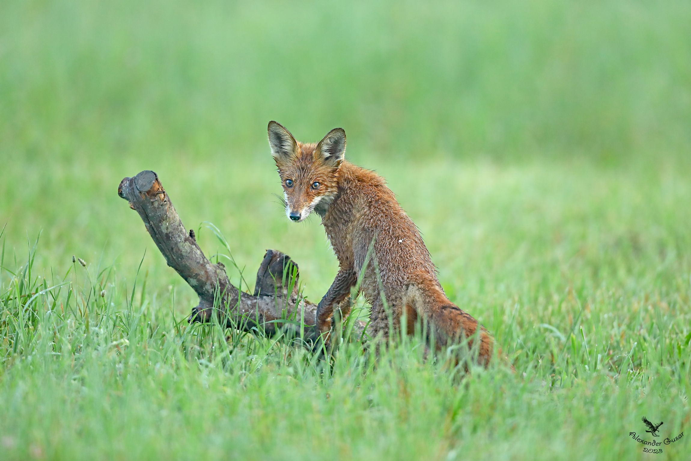 Этот лисёнок появился как чертёнок из табакерки. Время 05.30 , туман, роса , я только раскидал и закрепил приваду ( мясо ) на присаду на поляне где прикармливаю орланов, канюков , луней и зашёл в палатку. Только поставил аппаратуру как вижу на поляне хозяйничает этот нахалёнок. Ладно ба жрал мясо раскиданное по поляне , его там десять кило, так нет ему в первую очередь надо оборвать всё мясо с присады. Я и свистел , и орал , что бы из палатки не выходить , но ему было всё равно , посмотрит в мою сторону и пока всё не оборвал не успокоился. Тогда уже пришлось выйти из палатки и прогнать его . Закрепив новую порцию мяса на присаду , вернулся в палатку , но какое же было у меня удивление когда он через пятнадцать минут нарисовался снова и напрямик направился к присаде за мясом. Пока я выходил из палатки , он успел оторвать один кусок мяса и убежал. Больше он не появлялся , да и хищных птиц не было. Прилетают когда стоит фотоловушка . Но надеюсь на лучшее.