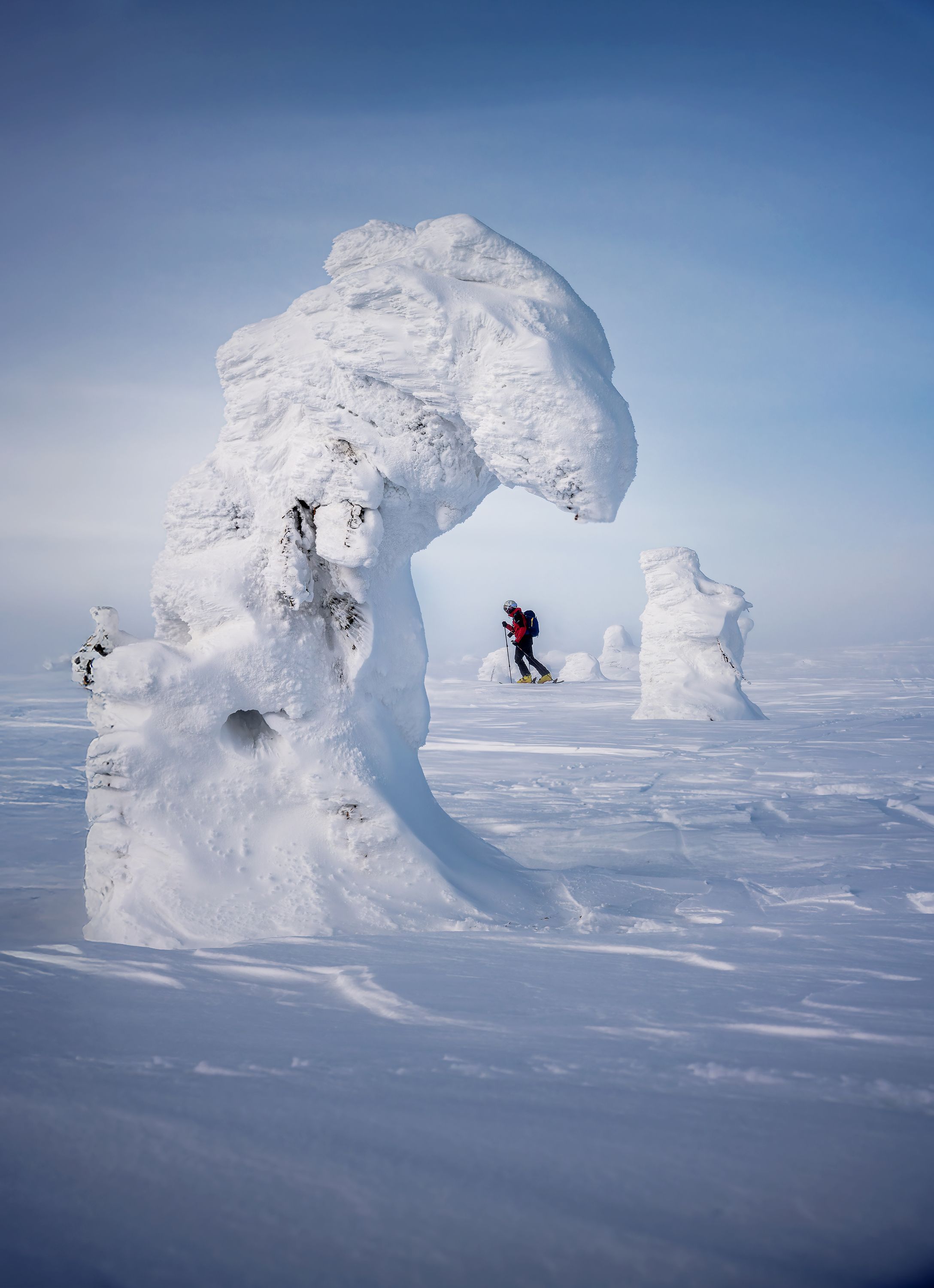 Снег превратил камни в скульптуры, а лыжника — в точку в бескрайнем Урале. 🌨️🏔️