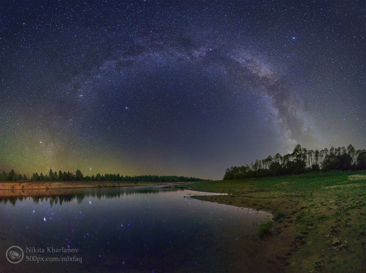 Млечный путь над рекой Сож в Гомельской области. Фото сделано с середины реки из-за того что уровень воды опустился на 2 метра. Слева светится атмосферное сияние (Air glow)