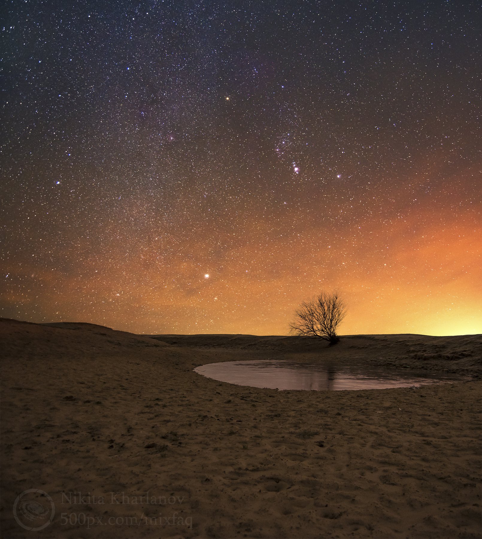 астрофото, астрономия, астрофотография, ночной пейзаж, Млечный путь, звездный путь, звезды, звездная ночь, звезда, созвездие, созвездие Ориона, Ригель, Сириус, облака, туманное небо, сияние атмосферы, ночной пейзаж, астропейзаж, одинокое дерево, дерево, к, Харланов Никита