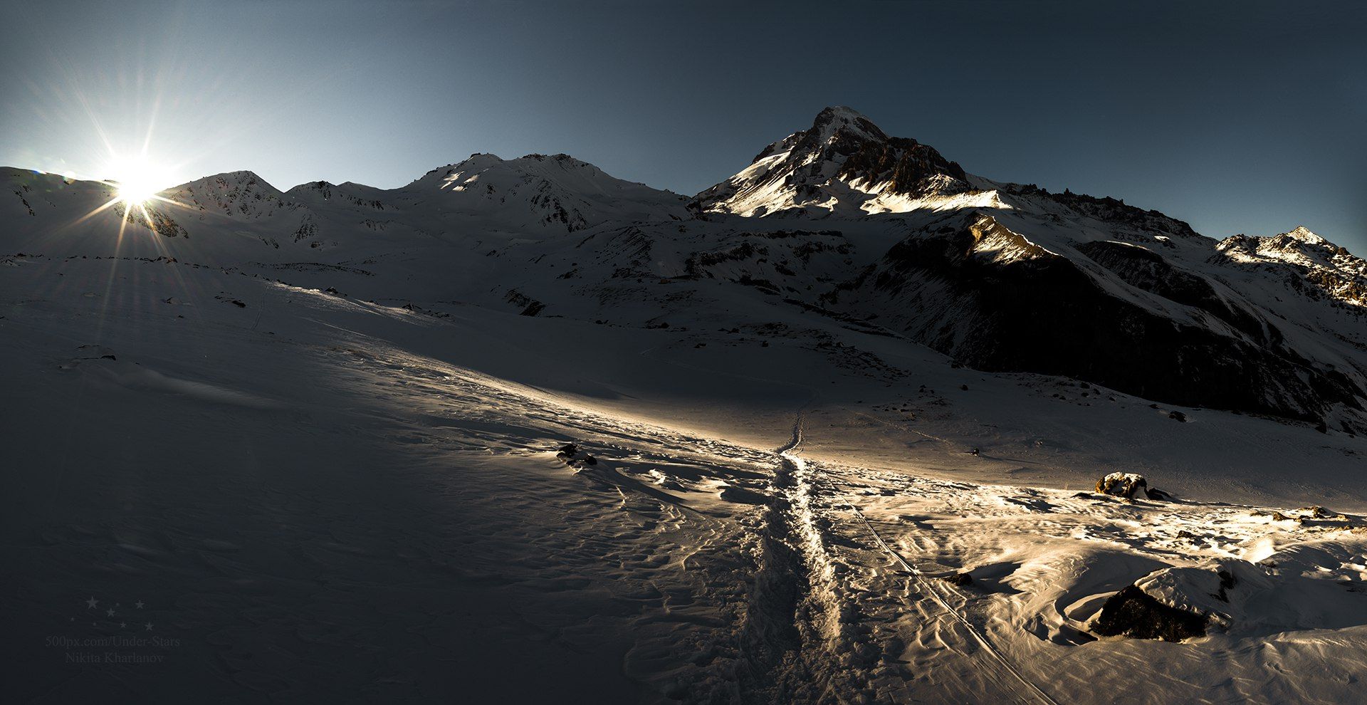 Кавказ, Грузия, Казбек, Казбеги, горы, закат, солнце, снег, тропа, путешествие, Харланов Никита