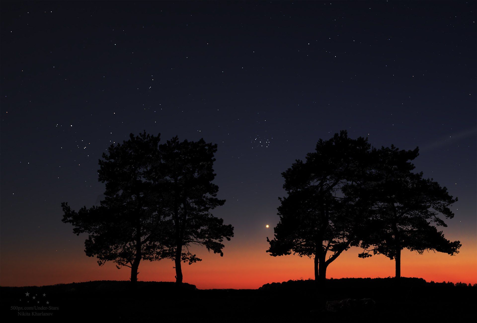 астрофото, ночь, звезды, Венера, Плеяды, закат, деревья, силуэты , Харланов Никита