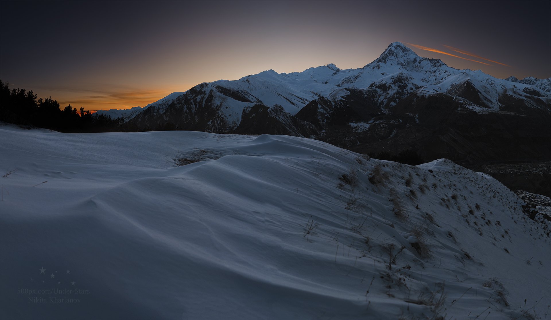Казбек, Казбеги, Кавказ, Грузия, зима, горы, закат, Харланов Никита