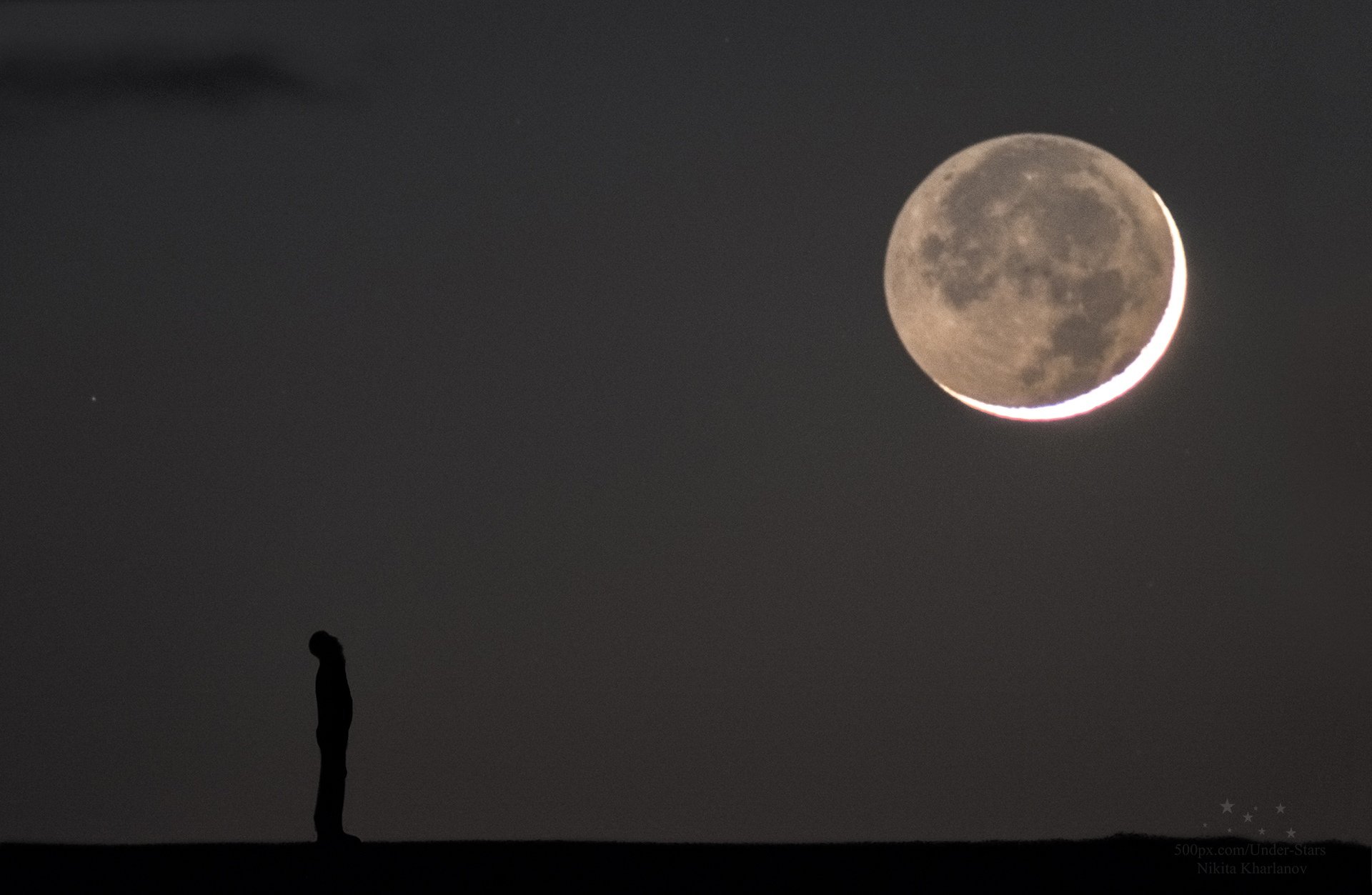 луна, месяц, звезды, силуэт, ночь, астрофото, пепельный свет луны, телескоп, Харланов Никита