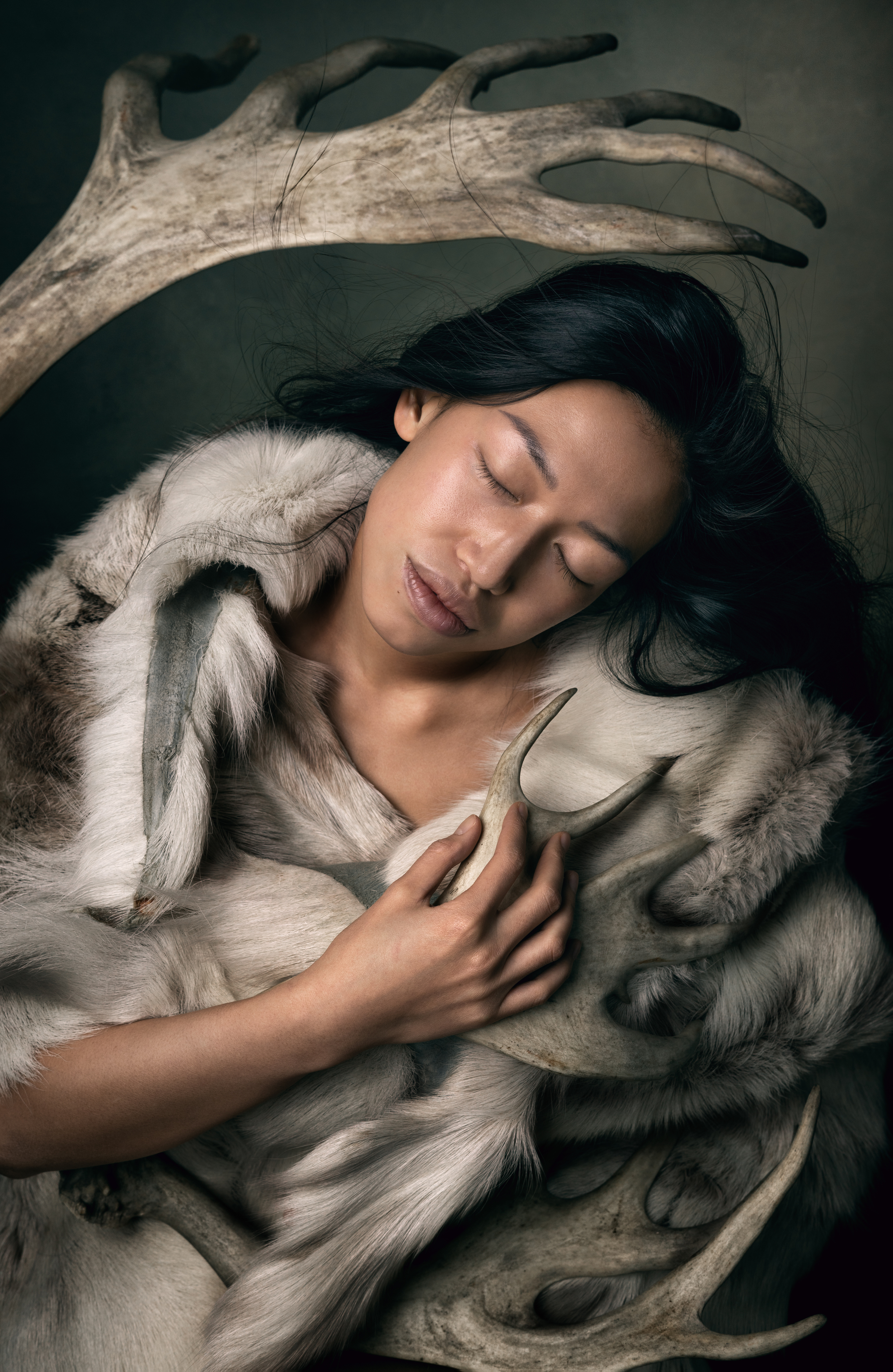 На снимке запечатлена женщина, погруженная в сон, её тело укрыто мехом, а над головой — массивные рога, словно охраняющие её. Композиция передаёт ощущение единения с природой, древнего ритуала и внутреннего покоя. Свет мягко подчёркивает контуры лица и текстуру меха, создавая атмосферу мистики и умиротворения. Фотография — это не просто портрет, а поэтическое повествование о связи человека с диким миром.