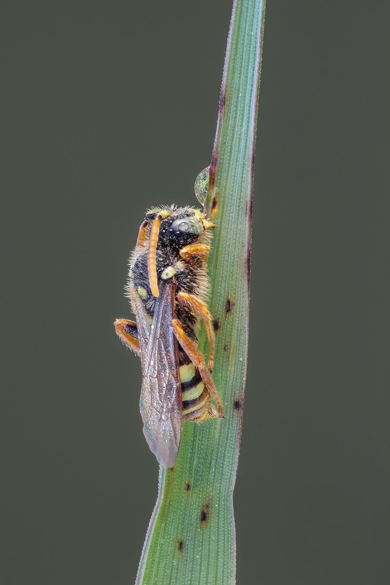 Спасибо за комментарий! Пчелка висит над травинкой, держится только челюстями. Наверно поэтому почти нет теней. Свет естественный.