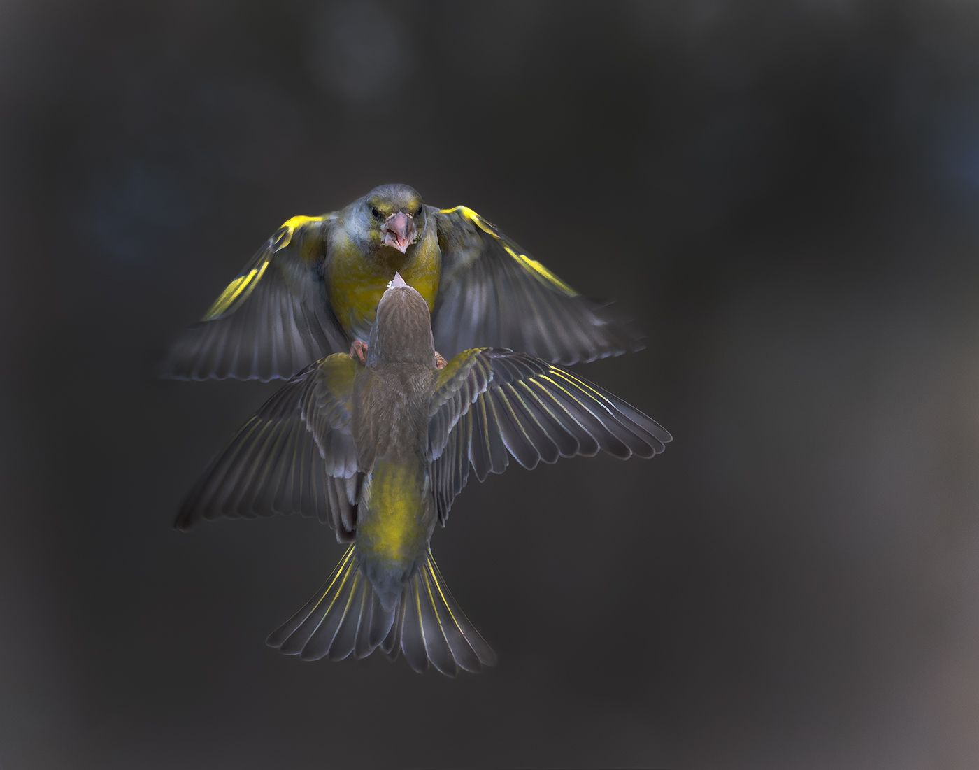 В этот мгновенный кадр вложена вся сила природной борьбы — два птицы, возможно, соперники за территорию или пищу, вступают в воздушную схватку. Крылья, расправленные в атаке, тела, сближающиеся в стремительном движении, — всё это передаёт напряжение и драматизм. Темный, размытый фон усиливает фокус на действии, превращая сцену в почти кинематографичный кадр. Фотограф Стефан Дянков запечатлел не просто момент, а эмоцию — борьбу за выживание в дикой природе, где каждый полет может стать решающим.