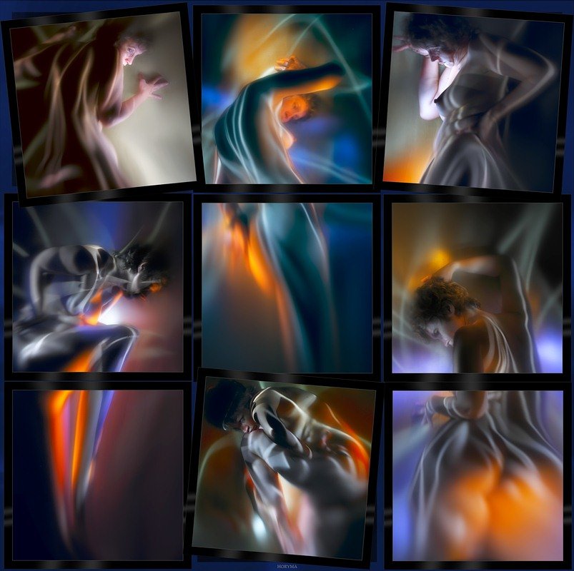 Надели на камеру ленсбебик (это такой гибкий объектив о трёх тоненьких ножках и кнопкой фиксации положения) и поигрались с диафрагмой. Оставили в будущем кадре небольшое "пятно резкости" и начали рисовать светом. Конечно, самые хорошие кадры - это те, которые не получились, по разнообразным причинам. Ладони потели - фонари выскальзывали. Жара густой субстанцией, замедляла все движения в тёмной комнате. Фотоаппарат лениво щелкал затвором, захватывая в кадр не всегда то, что хотелось. В общем, ВСЁ кругом виновато. Виновато настолько сильно, что после съемок ОНО на коленях просило прощения):