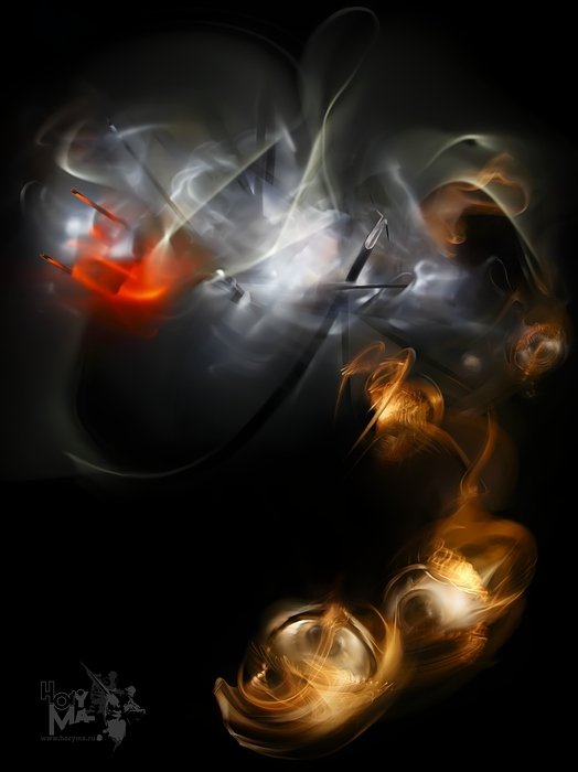Первым делом вылетают глаза. Ба.. да их тут несколько. Вот парочка на переднем плане.. а вон ещё летит один.. а может парочка. Откуда же они так вылетают? Ну скорее всего они вылетают из субстанции мыслей. Вылетели посмотреть на картину. Ага, значит блестящий взрыв света - это пучек мыслей в мозгу, хорошо.