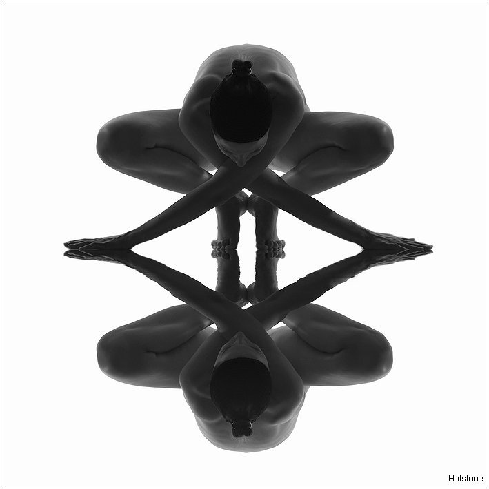 Как делается так, чтобы фигура и отражение были абсолютно зеркальными? Во-первых, я не понимаю с какой точки нужно снимать. Все мои немногочисленные познания в оптике говорят о том, что фотограф должен лежать на полу. Те же познания говорят о том, что в отражение ну никак не могла попать спина.