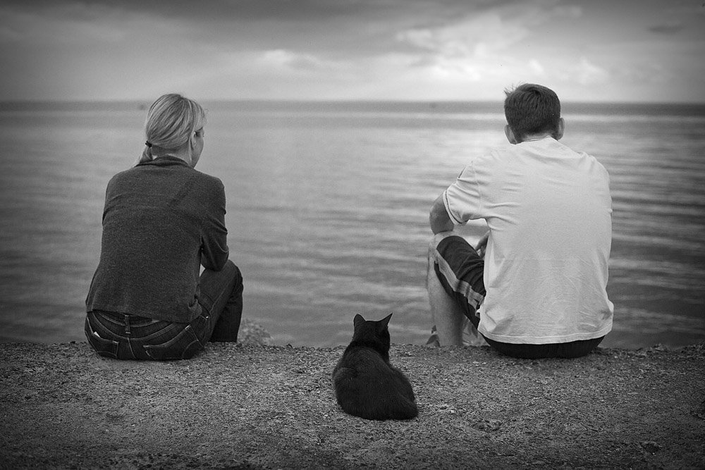 A nő gondokkal terhelve elmereng és a távolba néz némi optimizmussal. A férfinél más a helyzet, ugyanazt a mondókáját ismétli már sokadszor a nőnek, ami már nagyon unalmas a nőnek. A legjobb helyzetben a cica van, nyugodtan ül, pihen és a távolba néz. A cica egy józanabb, egy rohanás nélküli életformát szimbolizál. A pár már régóta dúl-fúl egymagában, amikor mindketten hátra néznek. Észreveszik a cicát és végleg arra gondolnak, hogy változtatniuk kell az életformájukon, ami valószínűleg sikerülni fog.