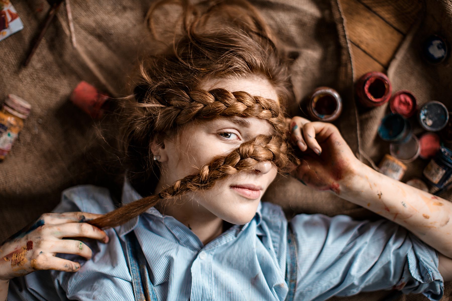 ГуашьЕстественный светКистиКосаКосичкиКосыКраскиКраскихолстМальбертОранжевыйСинийУтрожелтыйХолстХудожникхудожница