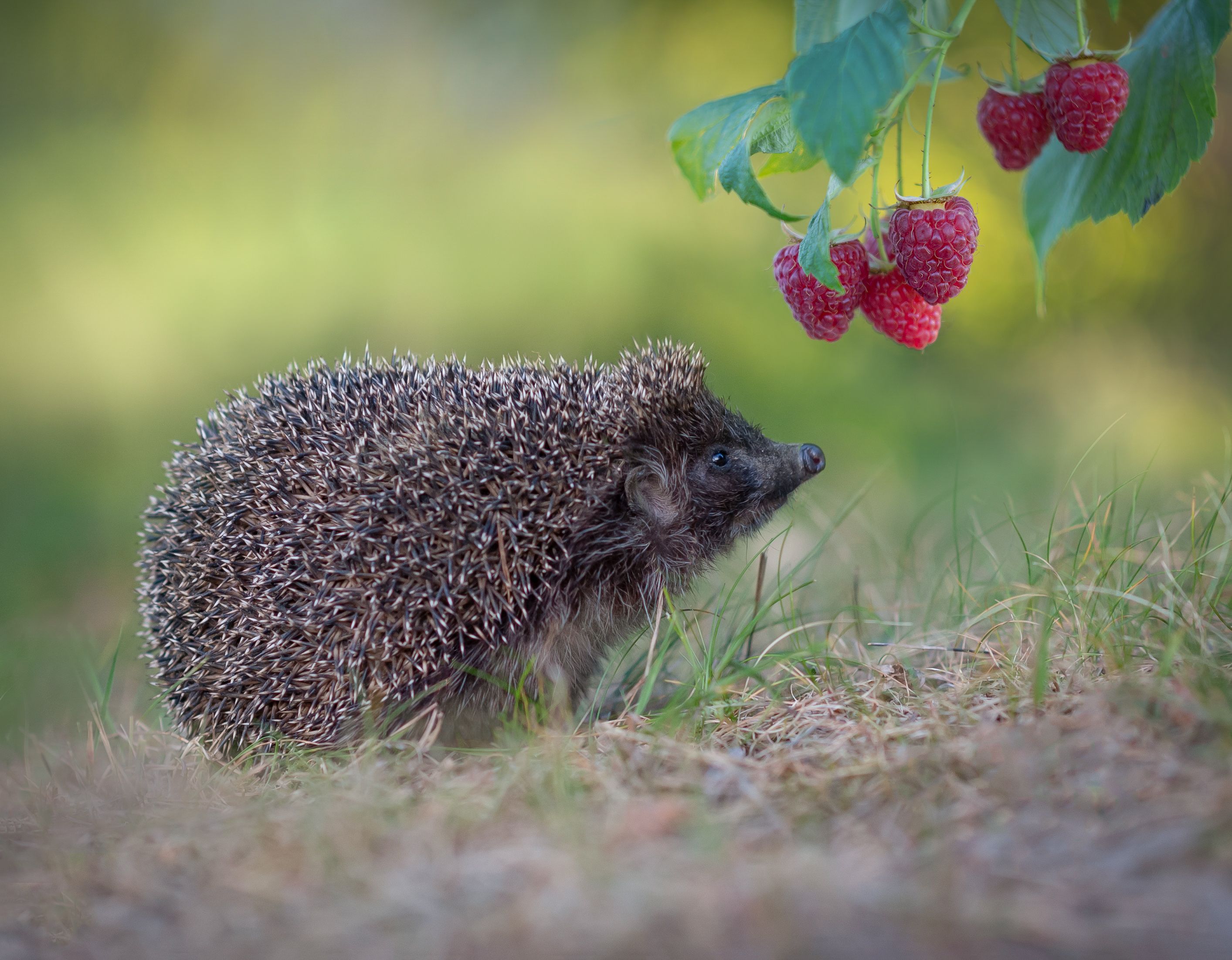 На фоне мягкой зелени и золотистого света заката ёж, покрытый колючками, внимательно изучает спелые ягоды малины. Его нос слегка подрагивает — он чувствует аромат и сладость. Сцена передаёт тихую гармонию природы, где каждый момент наполнен ожиданием и нежностью. Фотография запечатлела мгновение, когда дикое и доброе соприкасаются.