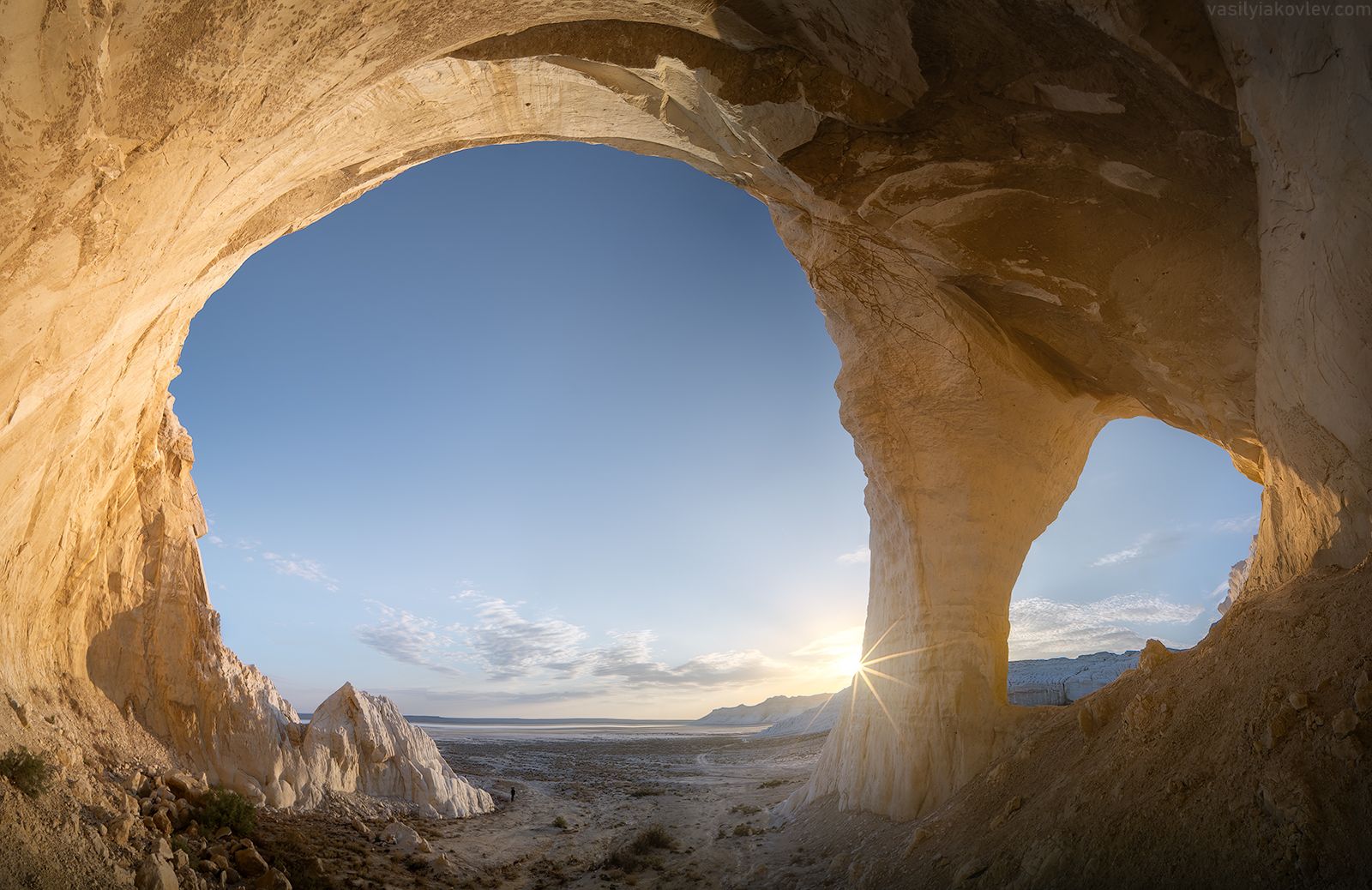 Сор Тузбаир - еще одна потрясающая локация, и одна из любимых точек в Мангистау. Пожалуй, эта локация - самая разнообразная в плане съемочных сюжетов. Здесь можно снимать солончаки, и если есть вода - то отражения, если нет, то соляные узоры. Можно снимать основания чинков (чинок - обрывистый труднодоступный уступ) - фактурные "щупальца", играть с линиями и формами. И, конечно, одна из визитных карточек Тузбаира - вот эта арка. Она красива со всех сторон! А какой здесь Млечный Путь ночью (как раз внутри арки! Но ночной снимок позднее. А пока, вот такая панорама на 9мм (на 14мм сюжет тоже умещается).