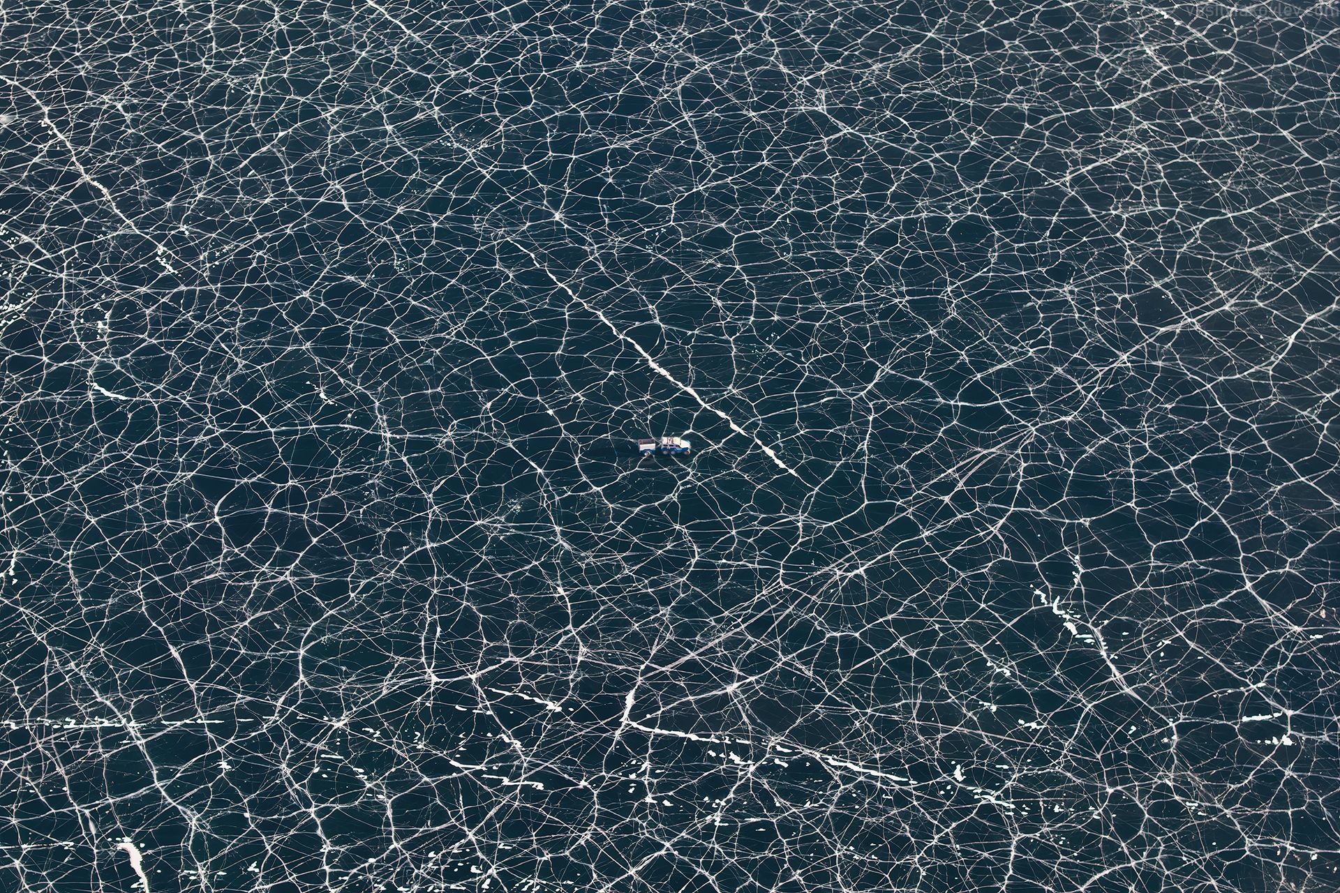 В этот раз на Байкале лед порой был настолько тонкий (а местами его вообще не было), что даже на Трэколе до ряда локаций нельзя было доехать, и приходилось задействовать Хивус (судно на воздушной подушке). Но постепенно лед окреп, и мы начали выезжать на съемки на Трэколе. Этот немаленький трехосный вездеход с прицепом с большой высоты выглядит будто игрушка среди величия байкальских льдов.