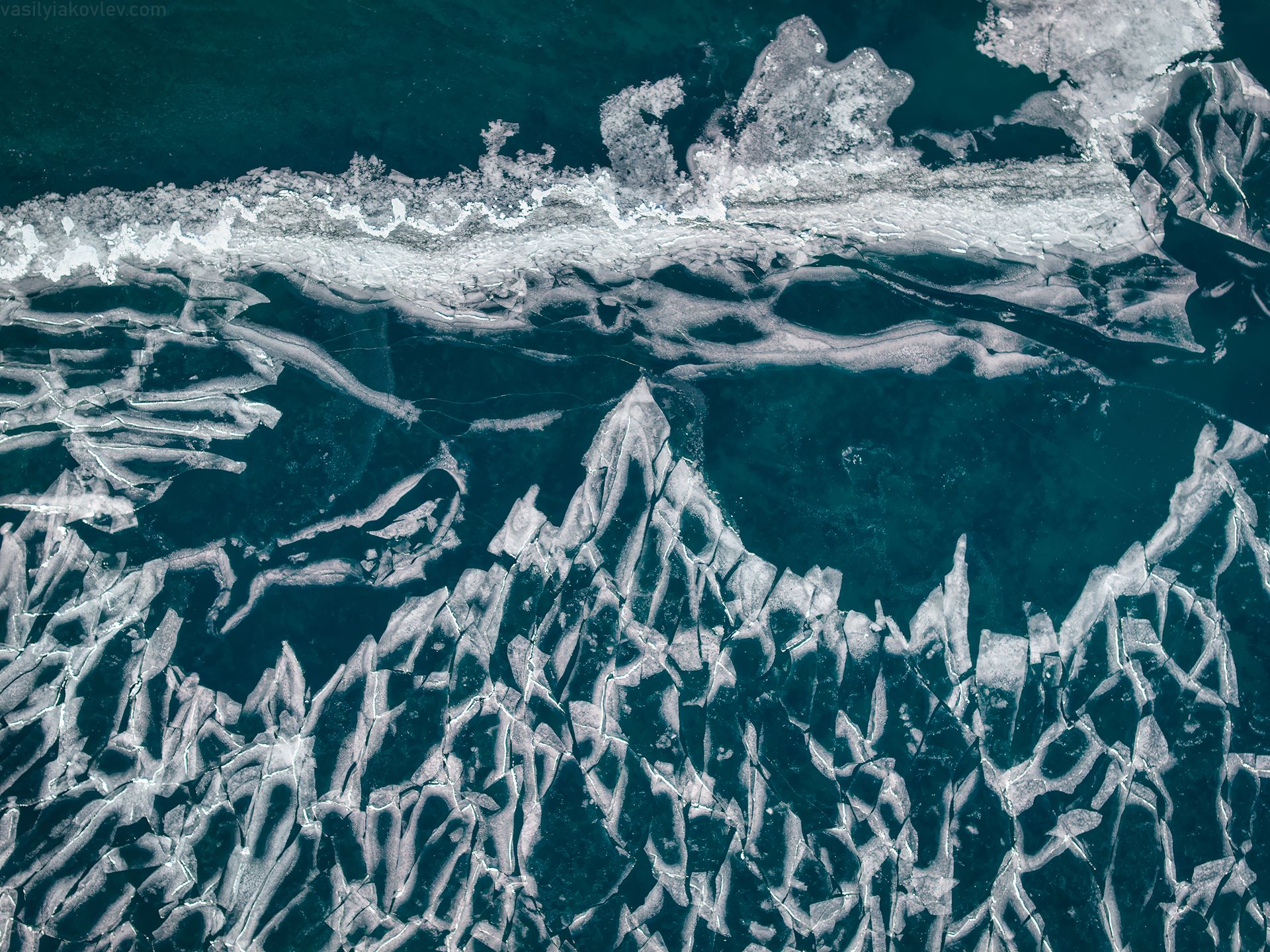 Озеро Байкал, январь 2025. Ледяные узоры Байкала зачастую особенно интересно разглядывать с высоты. Даже в отдалении от берега лед и вода Байкала настолько прозрачные, что даже на глубине хорошо видно дно.