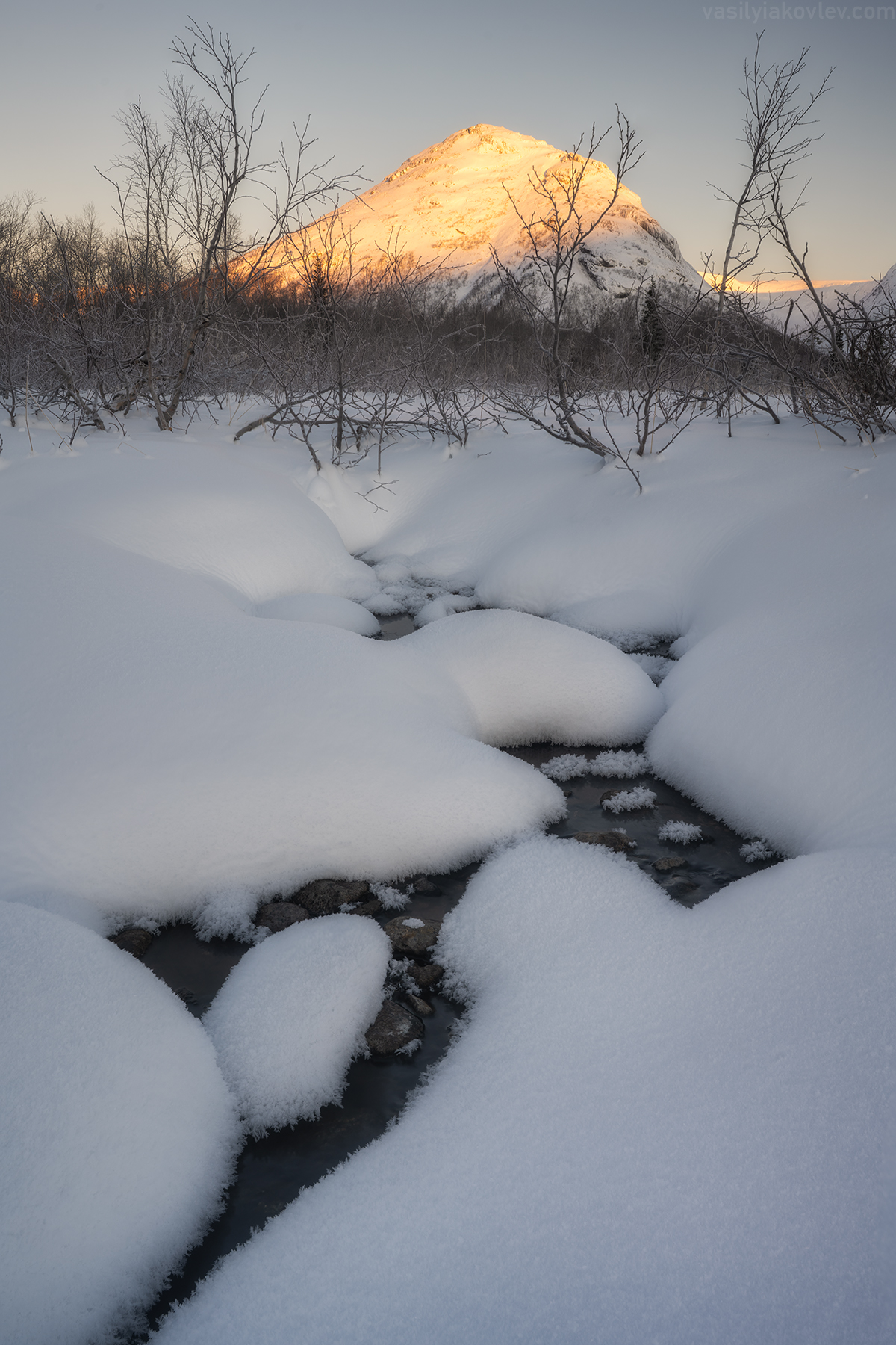 Спасибо за снимок — мощная зимняя сцена, где свет на вершине горы контрастирует с холодной тенью внизу, а ручей, пробивающийся сквозь снег, добавляет динамики. Очень выразительно передано ощущение первых морозов в Хибинах.