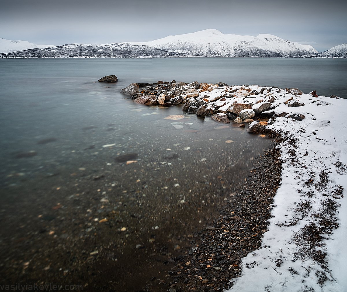 Пляж в окрестностях самого северного крупного города в мире - Тромсё, Норвегия. Февраль 2019. Панорама, 2 вертикальных кадра.