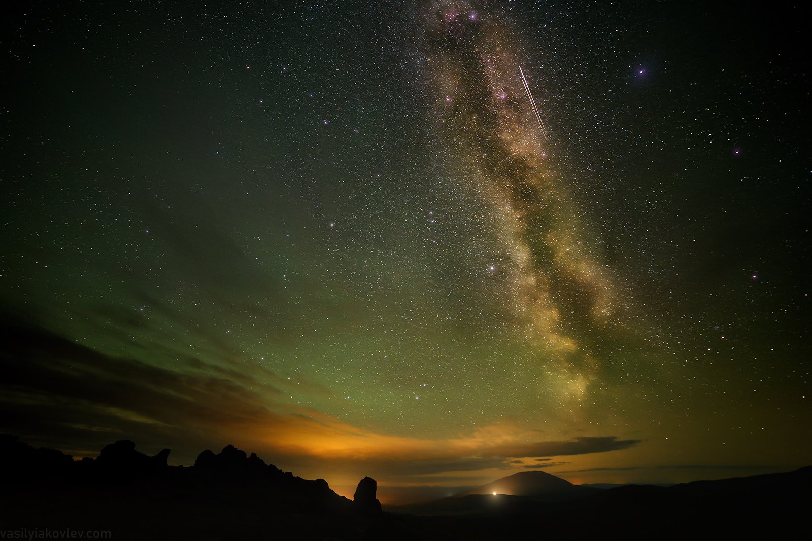 Северная Уральская природа меня поразила своей красотой, но когда стемнело, оказалось что ночи здесь не менее прекрасны, чем дни! Небо усыпано миллионами ярких звезд, а млечный путь хорошо виден невооруженным взглядом. Нам повезло с погодой, было тепло, безветренно и безоблачно, и мы всю ночь любовались звездами. Здесь, в Уральских Горах, хорошо видно собственное свечение атмосферы. Кадр украсили два параллельно плывущих по небу спутника морской навигационной системы NOSS 3-3.