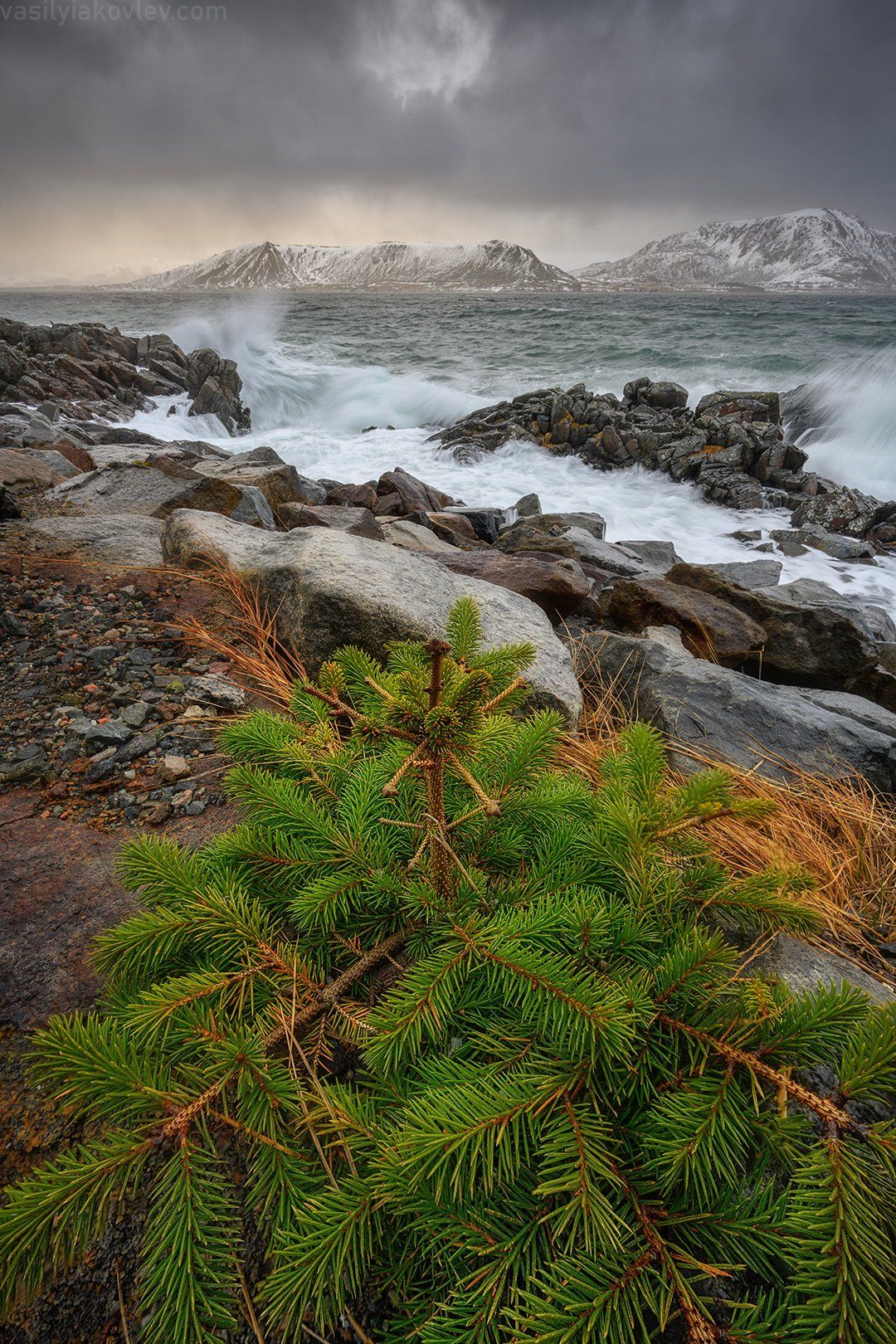 Даже вдали от дома, в Заполярной Норвегии, глаз сразу замечал родные сердцу сюжеты - елочки, да сугробы (сугробы будут позже). Эта небольшая, но очень красивая елочка росла прямо вдоль дороги, на живописном скалистом берегу рядом с небольшой рыбацкой деревушкой Napp.