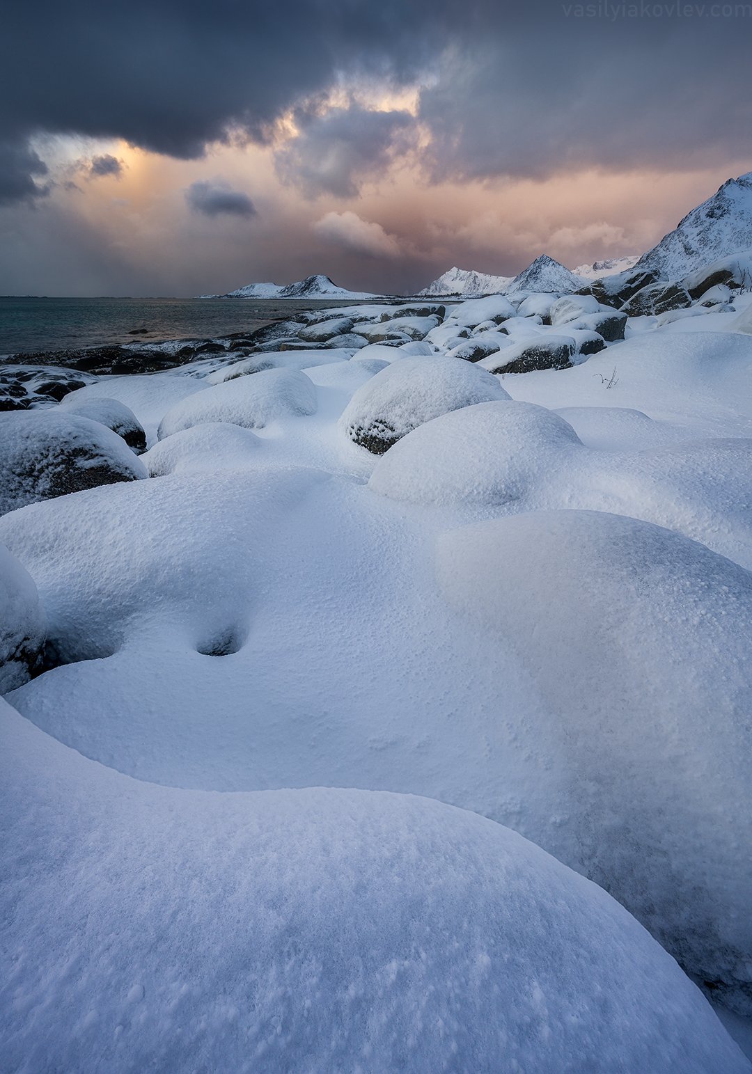 На Лофотенах в феврале очень суровая и переменчивая погода, невероятной силы ветра, град, дождь, снег. Но для меня, как для фотографа, такие перемены погоды, наоборот, в радость. Вообще смена погоды это почти всегда красиво - глубокие цвета, драматичное небо. И конечно повезло, что удалось отснять норвежские берега и под снегом, и без него.
