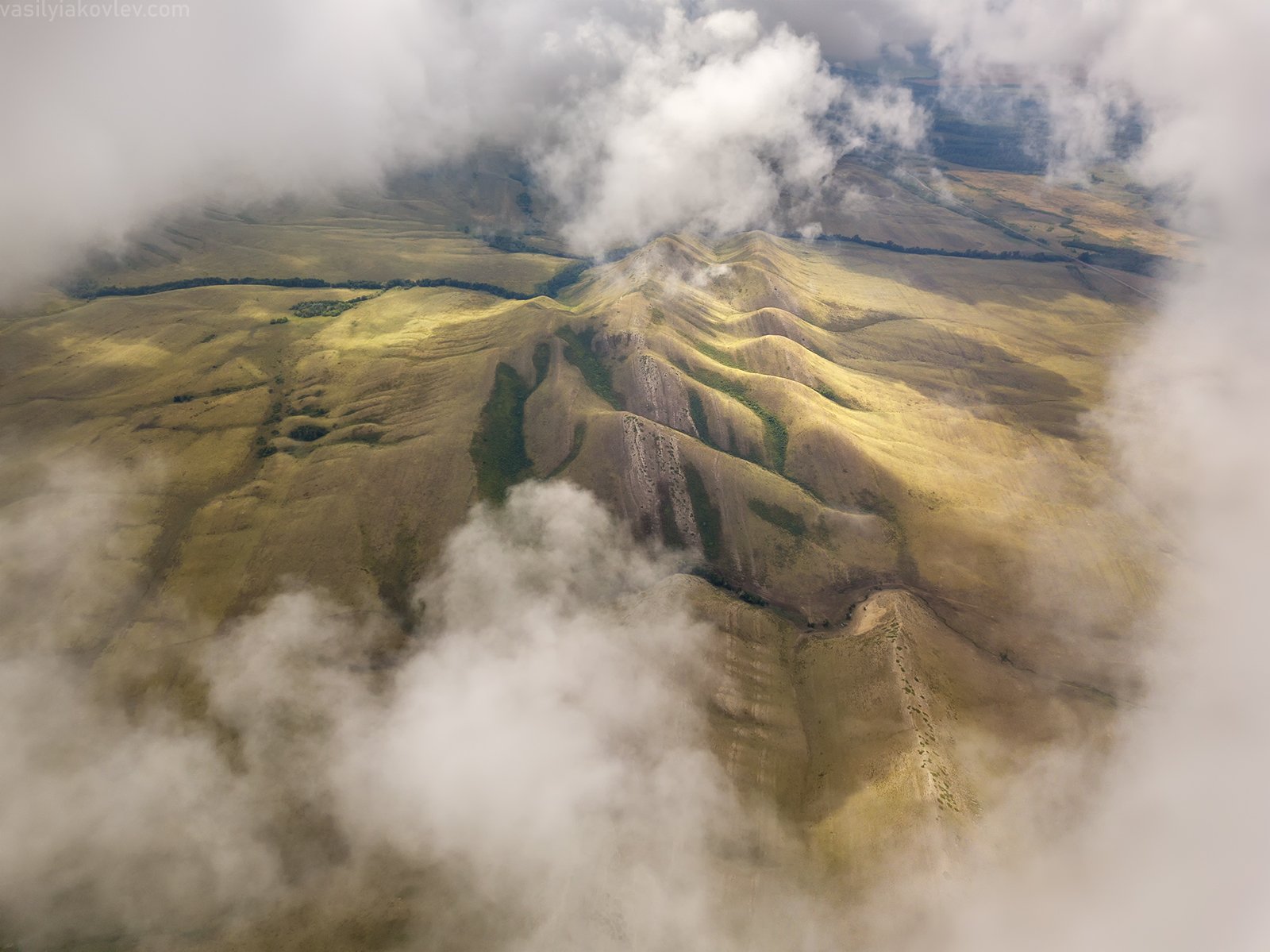 Утро было пасмурным. Рассветную съемку мы благополучно проспали, периодически выглядывая из палаток по будильнику в надежде на просветы на небе. Небольшие окна в облачности стали появляться уже после восхода солнца. Свет ложился пятнами на хребет, подчеркивая фактурные складки. Я поднял дрон в небо, чтобы сделать несколько снимков световых пятен на хребте, уже в полете мне пришла идея подняться выше облаков. Пришлось взлететь на высоту более 1км, чтобы оказаться над плотным слоем облаков, которые бежали по небу довольно быстро. Небольшие просветы периодически появлялись и тут же исчезали, ветер был довольно сильный, но вдруг красивый по своей форме просвет появился именно там где нужно, прямо над хребтом, еще и красивый свет лежал на склонах, и мне посчастливилось сделать этот необычный снимок хребта Карамурунтау.