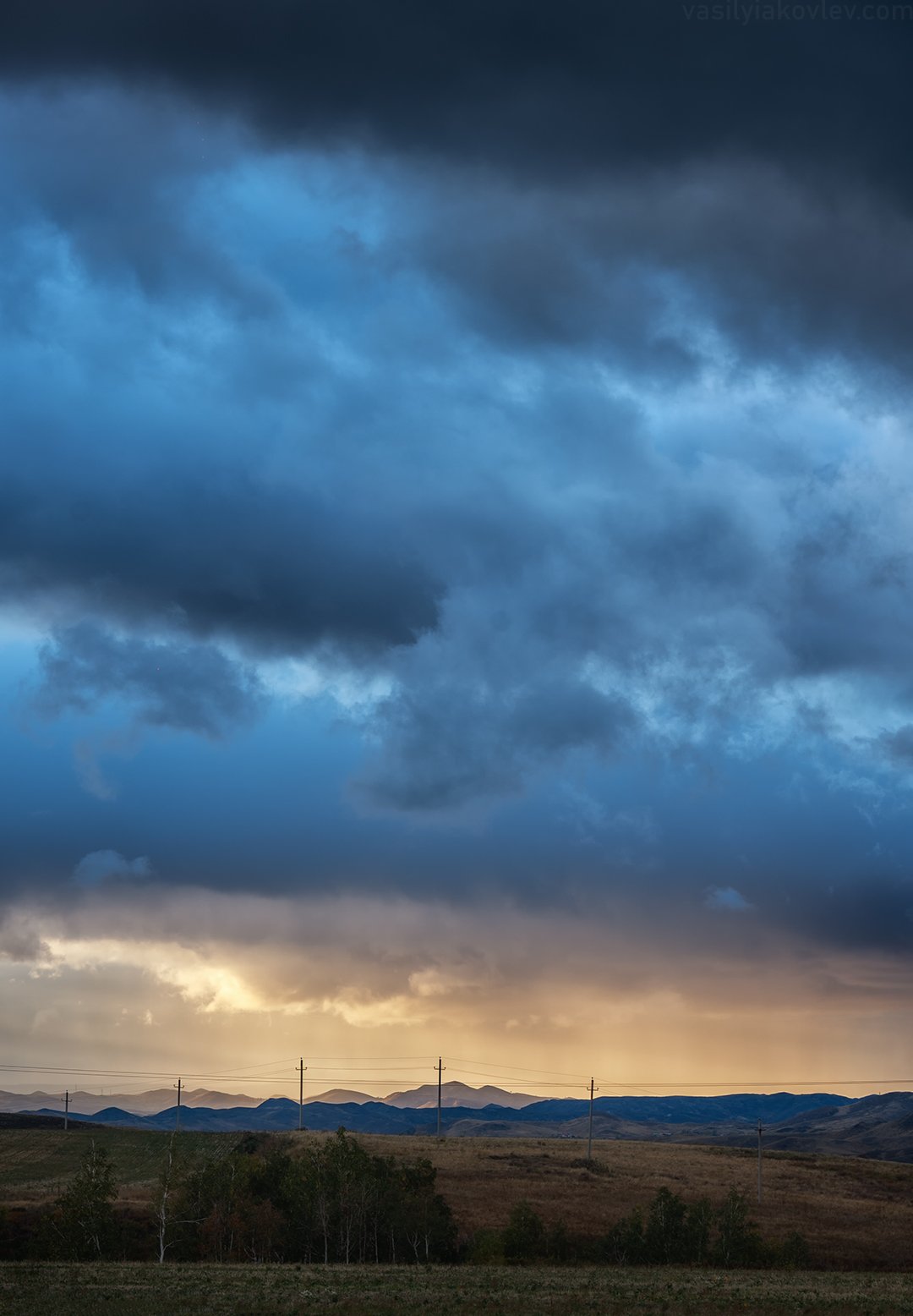 Невероятно красивый закат удалось застать в дороге, в Оренбуржье. Небо переливалось оттенками синего и желтого, и окрашенный в смесь этих цветов свет падал на холмы с противоположной закату стороны.