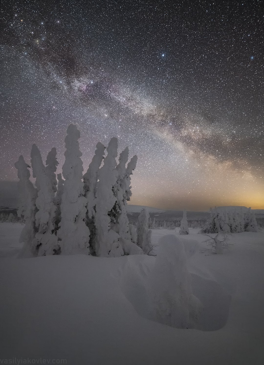 В марте на ГУХе повезло, наконец, увидеть ясное звездное небо. Хотя я на ночную съемку особо не рассчитывал и даже не взял с собой астротрекер. Пришлось снимать по-старинке, одним кадром, задирая ISO (в данном случае стояло ISO8000). Конечно, сейчас я жалею, что не "выжал" в процессе съемки все, что мог, и без трекера можно было снять лучше (сделать хотя бы десяток дублей для неба, снять качественно землю на длинной выдержке), но зимняя таежная ночь не располагала к длительной съемке, было холодно (все-таки было за -20°С с ветерком) и, признаюсь, несколько неуютно (хоть медведи и спят, а волков здесь давно не видели) снимать в одиночку вдали от избы. Сначала даже не хотел обрабатывать и показывать эту фотографию, но все же она для меня приятна как воспоминание о той хорошей, несмотря ни на что, ночи.