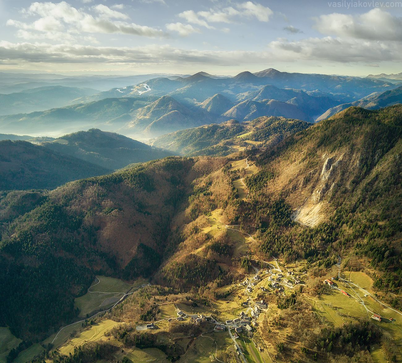 Предстоящую неделю буду делиться фотографиями Словении. На этом снимке запечатлена небольшая деревушка Podblica, случайно обнаруженная мной во время полета на дроне рядом с популярной среди фотографов живописной церквушкой в месте под названием Jamnik. Эх, немного "скучаю" по старенькому дрону DJI Mavic Pro, который позволял подниматься на большую высоту. Этот снимок сделан с высоты 1300м. Жаль, что в современных дронах ограничение по высоте в 500м пока нельзя убрать.