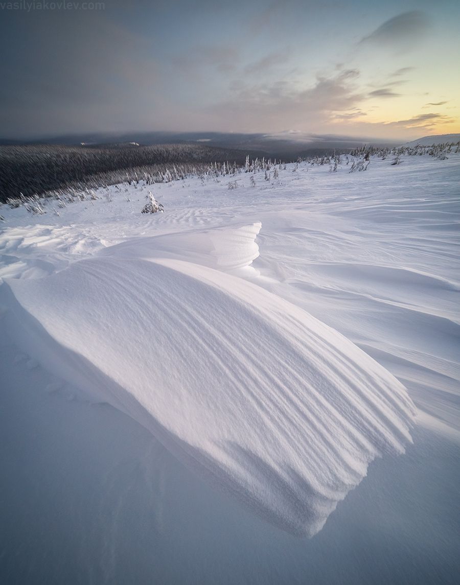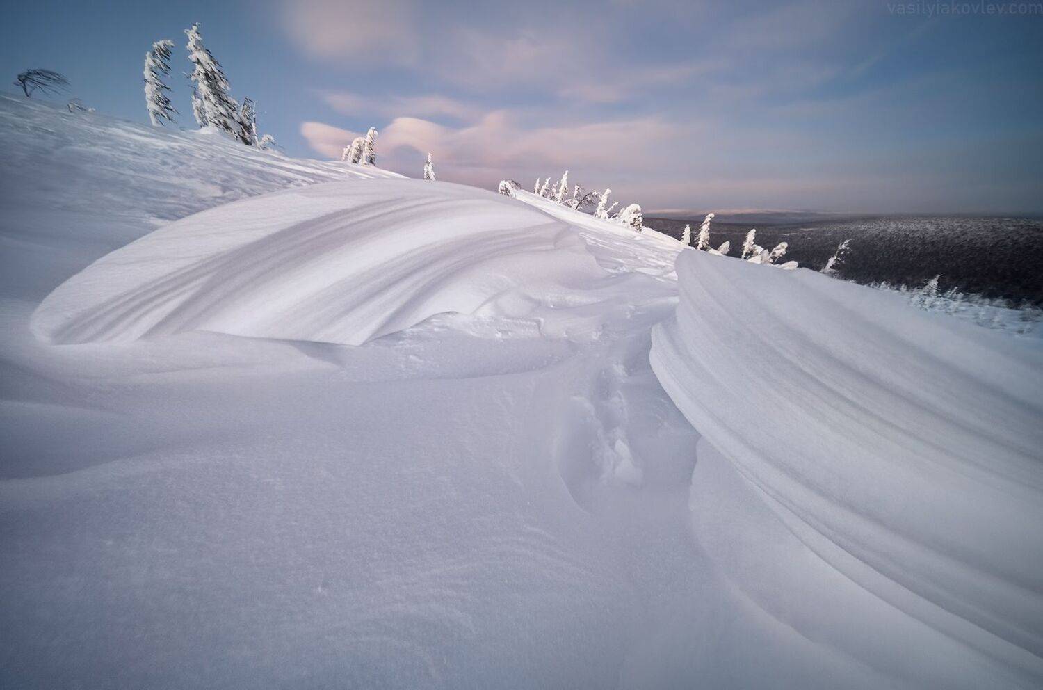 Мы вышли на маршрут уже на закате, который был весьма живописен (см. вчерашнее фото). Но и после заката задержались на локации, настолько интересные формы из снега были вокруг.
