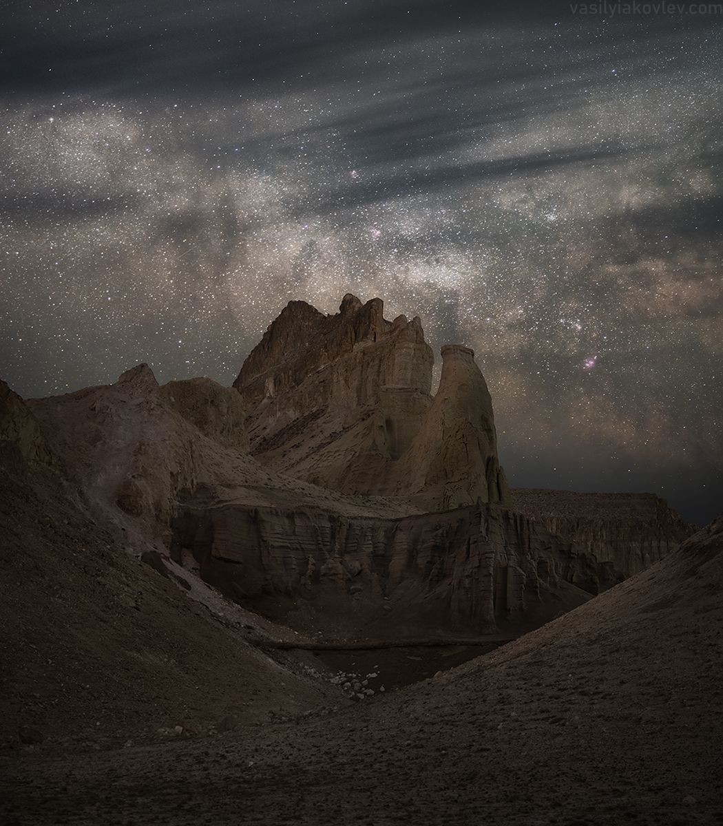 Люблю делать ночные снимки на "полтинник". Ночные фотографии, снятые на фокусное расстояние 50мм, смотрятся, на мой взгляд, по-особенному "уютно". Да и Млечный Путь, его ядро, с таким объективом как раз занимает весь кадр. Правда, под такое фокусное в пейзаже не так просто найти интересую композицию. Поэтому даже днем, находясь на локации, я нахожусь в перманентном поиске сюжетов под такой кадр. Так было и в этот раз, и, проезжая за рулем по Долине замков Айракты в Казахстане, краем глаза я заметил из окна уютный уголок в долине, остановил машину, сдал назад - точно, это оно! Фактурная двухцветная гора с темными бедлендами у подножия и выразительно торчащим клыком. Я определенно хотел снять это место ночью. В первую ночь в Айракты мы снимали на не менее интересных локациях, а вот на следующую ночь все-таки доехали сюда, и мне удалось сделать заветный кадр.