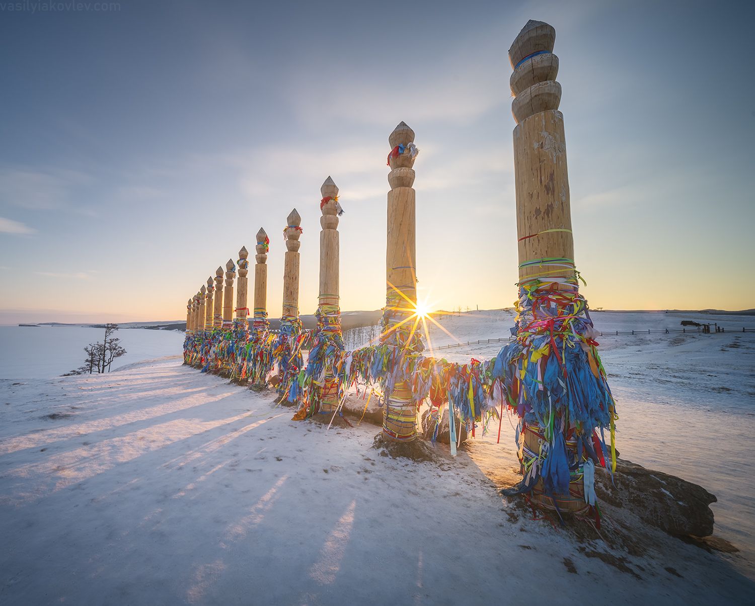 В пешей доступности от нашей гостиницы на Ольхоне расположено множество съемочных локаций. Вчера я показывал скалу Шаманку, которая в зависимости от ракурса открывает новые формы. Есть несколько интересных гротов (которые каждый год разные). Ну и, конечно, смотровая площадка на мысе Бурхан - место энергетической силы. Здесь же расположены 13 столбов сэргэ. Сэргэ – это символ дерева жизни, корнями в нижних мирах бесов и ветвями в небесах, где живут нойоны. Местные жители считают, что молитвы, которые написаны на этих ленточках из ткани доходят в небеса к богам.
