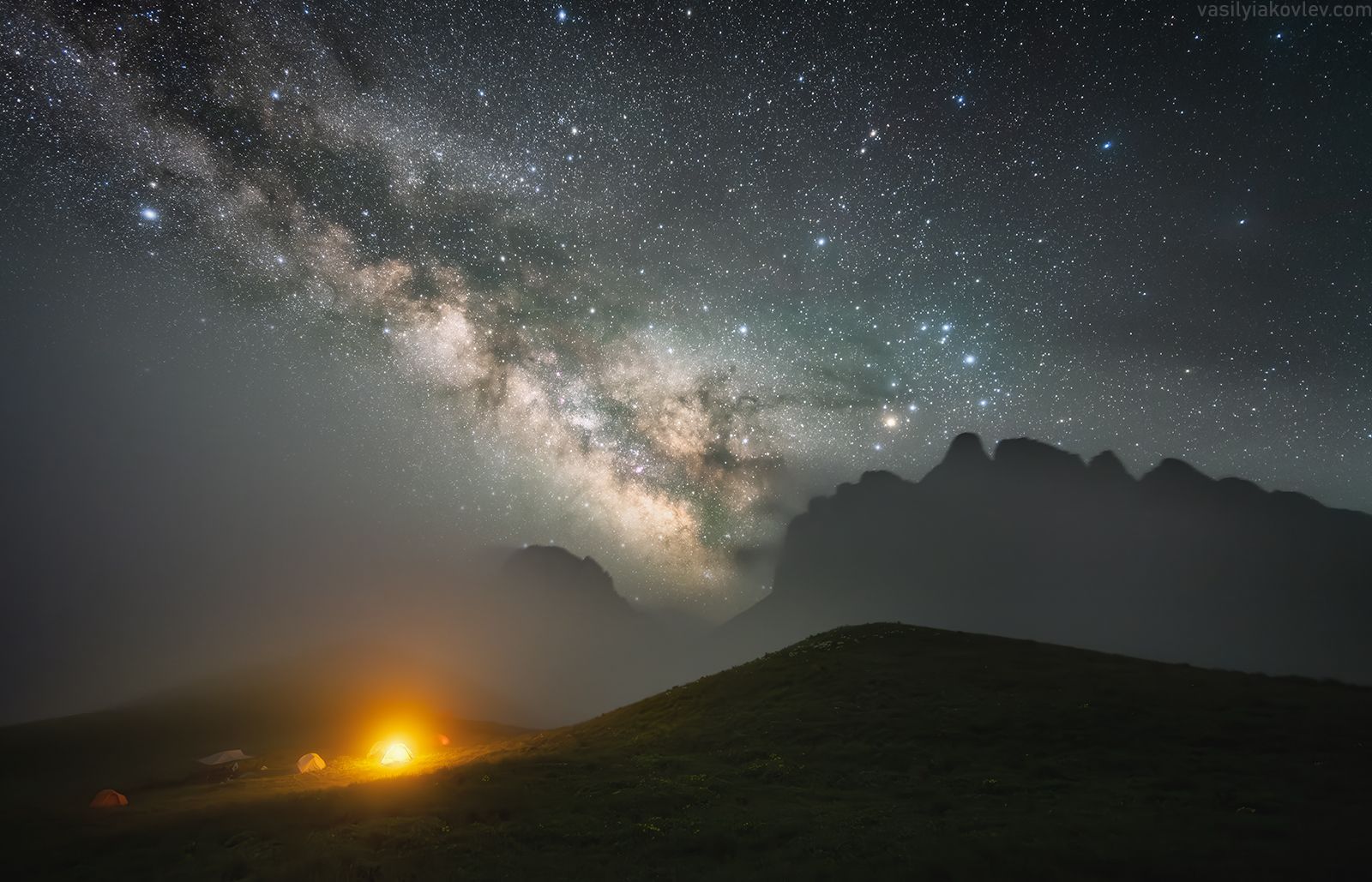 Начало ночи было многообещающим. Небо было ясным, а Млечный Путь начинал подниматься "в створе" Чертовых Ворот (между Западным и Восточным Ачешбоками). Я зажег свет в палатке и направился к намеченной ещё вечером съемочной точке. Когда я дошел и приготовился снимать, обстановка изменилась - из долины к Ачешбокам поднимался плотный туман, я быстро настроил камеру и успел сделать этот кадр. Через несколько минут из-за тумана небо уже не было видно. Но я был только рад таким переменам, туман придал кадру дополнительную изюминку.