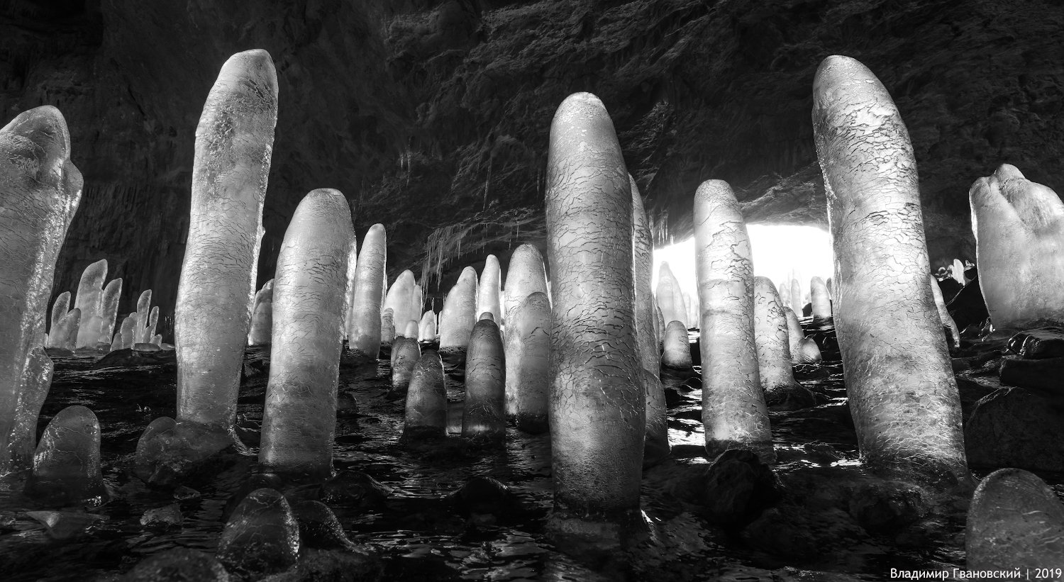 Татьянин грот расположен среди карстовых воронок Ай-Петринской яйлы и каждый год привлекает большое количество туристов. На покатом полу грота — десятки ледяных сталагмитов, высота некоторых — метр и более. Чувствуется, как весна входит в свои права — сталагмиты покрыты трещинами, внутри некоторых видна вода. Каждые пять-десять минут раздается звон — это падают с потолка ледяные сталактиты, грозя пробить череп неосторожному туристу. Пол грота — ледяной каток, на котором можно устоять лишь с помощью кошек, которых у нас нет. Но удача с нами — левая сторона грота совсем сухая, и вдоль стены можно аккуратно спуститься вниз и начать съёмку