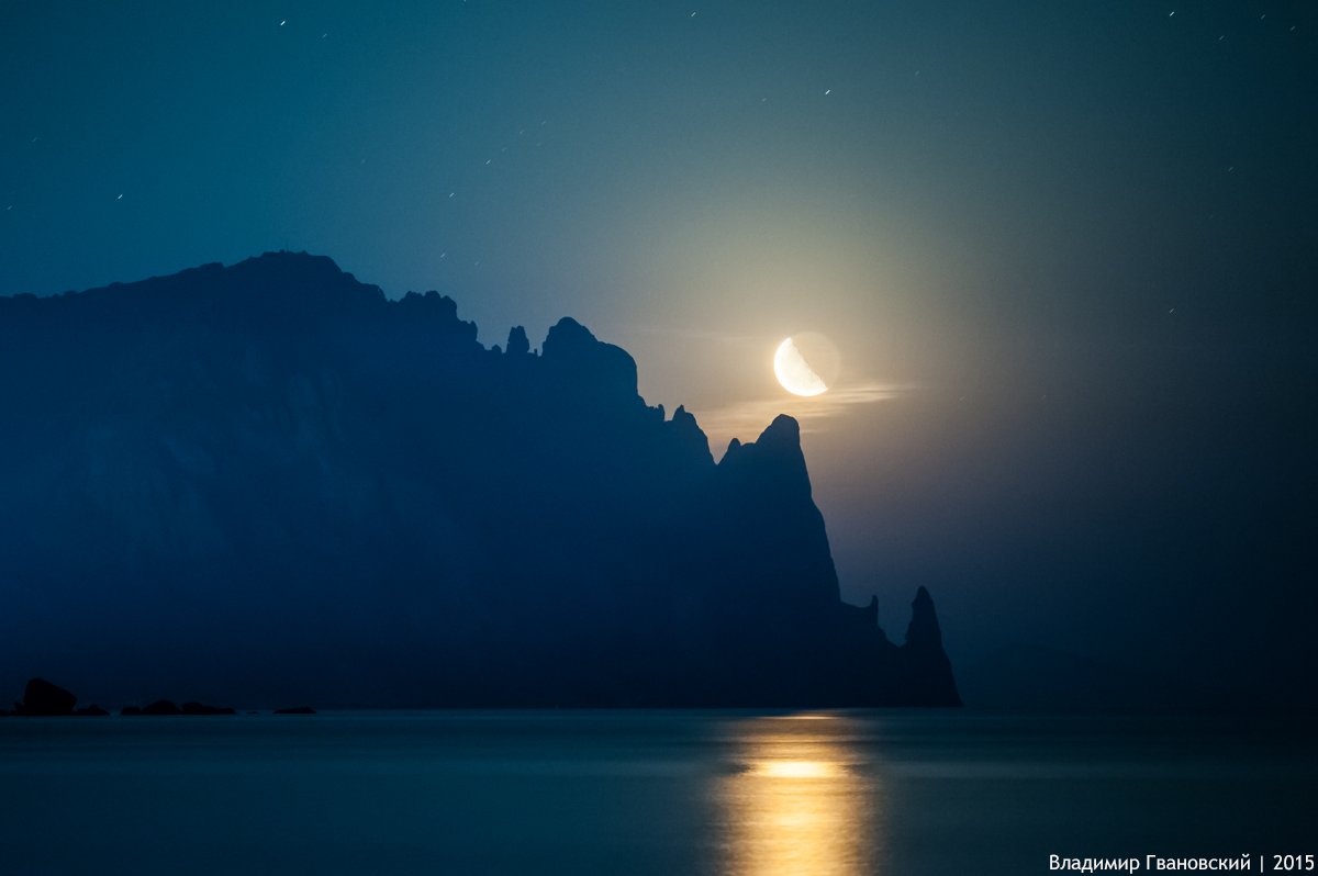 Когда на Лисью бухту спустилась ночь и проступили созвездия, я начал ждать Её. Мы сидели на тёплом песке, слушали волны, запрокидывали головы в черноту ночи, пили коньяк, закусывая душистым сыром. Потом ребята разошлись по палаткам, а я остался ждать. Рядом, заглушаемые прибоем, слышались голоса. Еле различимые в темноте, рядом со мной оказались двое: нагие парень и девушка, держась за руки, смеялись и бежали по пляжу. Потом промелькнула огромная тень - кто-то скакал по кромке прибоя на вороном коне, совсем не заботясь о тех, кто может сидеть в ночи на песке. Я всё ждал. Вдруг звёзды над Кара-Дагом начали тускнеть и гаснуть, потом зажглась едва видимая заря. Я улыбнулся и поднялся с песка, готовясь к встрече. Внезапно кожа Кара-Дага треснула, и из его черного тела дёрнулся свет - и вот уже Она, освободившись целиком, тихо поднялась вверх, над чёрными скалами-шипами, даря нам свет, озаряя колдовской пляж. Налюбовавшись вдоволь, я лёг и сразу уснул, готовясь к встрече другого восхода - солнечного