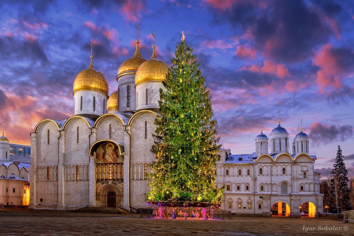 The main Christmas tree of the country on the Cathedral Square of the Moscow Kremlin, surrounded by the Assumption Cathedral and the Church of the Twelve Apostles.