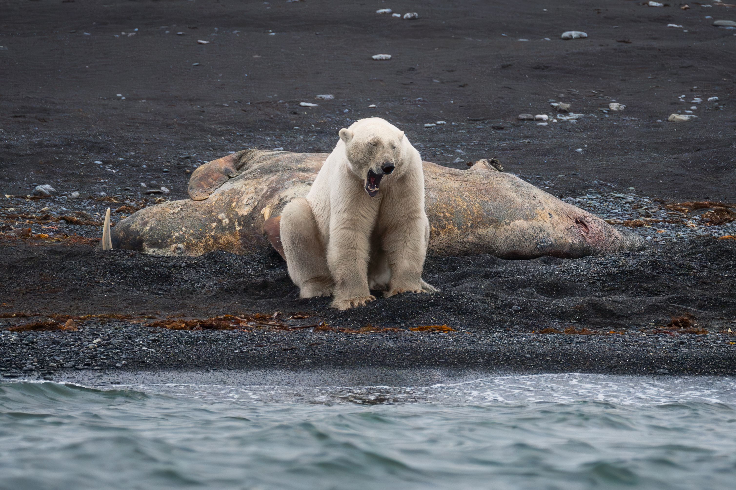 На затерянном острове Вайгач, где Баренцево море встречается с Карским, чёрная галька, словно остывшая лава, тянется к ледяным волнам. Среди этого монохромного пейзажа, осторожно обнюхивая берег, появляется медведь — бледный и бесшумный, как призрак. Многие километры он преодолел в поисках своей добычи. Снежная шерсть переливается легкими отблесками, а мощные мягкие лапы едва оставляют следы на мрачном берегу. В его глазах — древний холод Арктики, в теле — неумолимая сила выживания. Этот кадр напоминает о том, что даже в краю вечной тьмы и льда душа природы продолжает свой бесконечный путь.