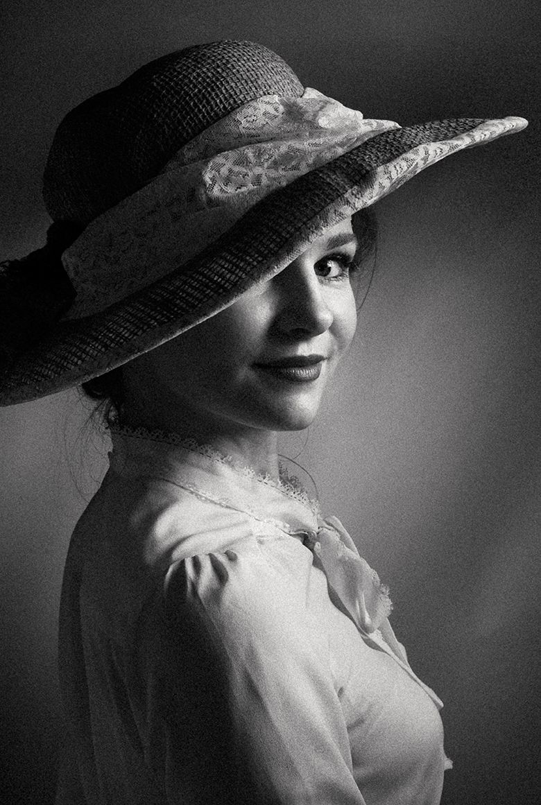 портретпостановочная фотографияв шляпечёрно-белоегламурретроartстудийный светулыбкапозитивноеромантическая