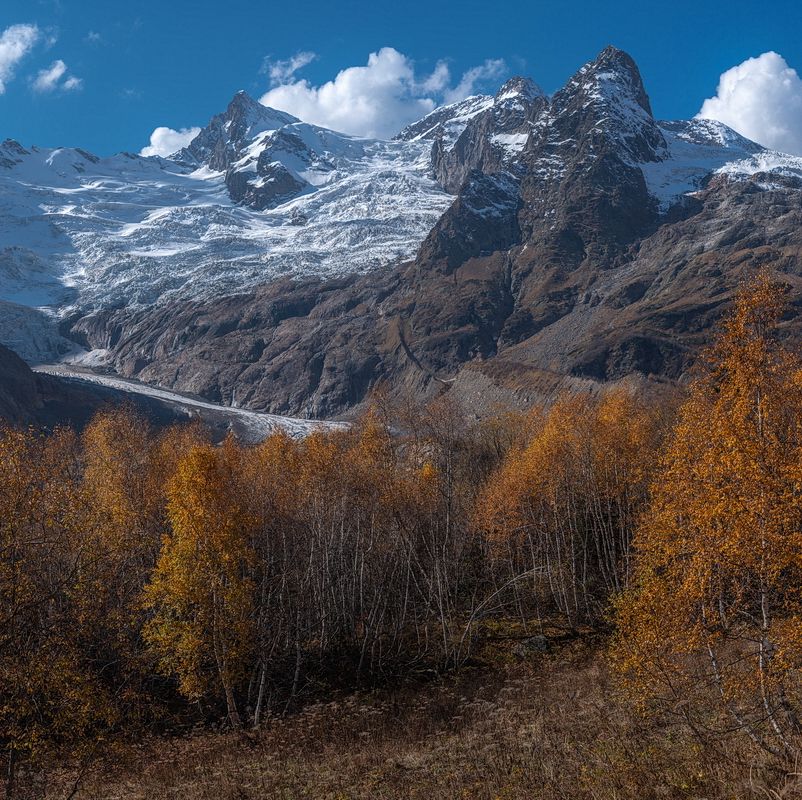 гора, рассвет, небо, плато, облака, долина, осень, домбай, деревья, листва, ледник, вершины, алибек, карачаево-черкесия, Арсен Алабердов