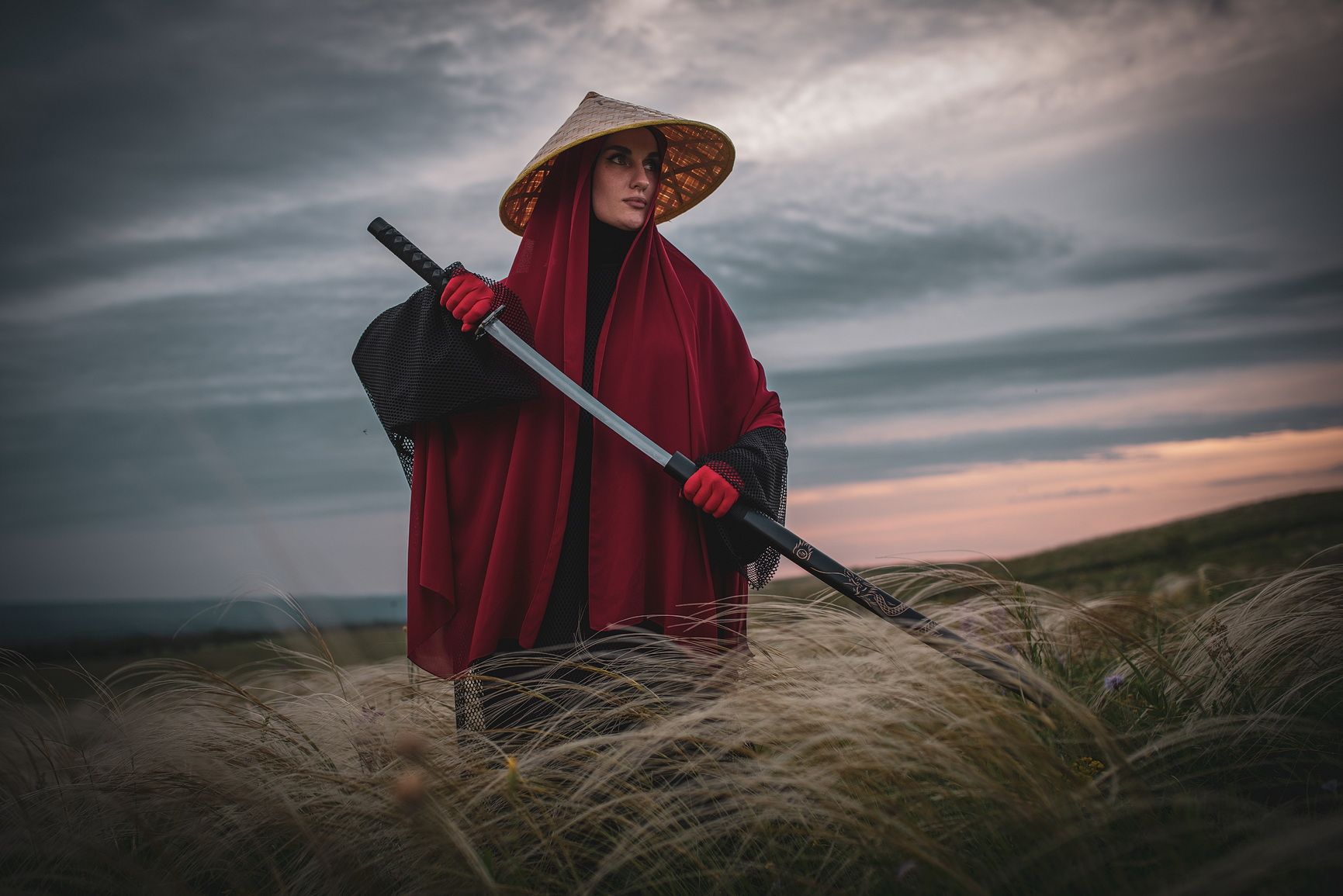 самурай, катана, япония, ковыль, меч, степь, воин, оружие, степь, закат, небо, женщина, Арсен Алабердов