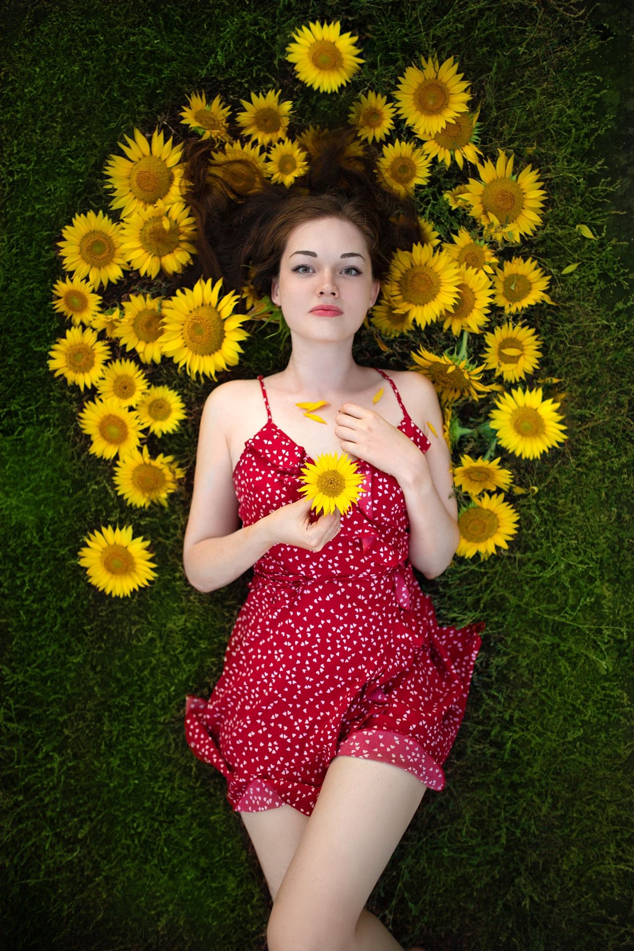 На фотографии изображена молодая женщина в элегантном красном платье с белым принтом. Она лежит на ярко-зеленой траве, окруженная большим кругом из свежих желтых подсолнухов. В руках девушка нежно держит один цветок, прижимая его к груди. Взгляд направлен прямо в камеру, создавая доверительную атмосферу. Снимок выполнен фотографом Алексеем Лозгачевым и передает теплое летнее настроение.