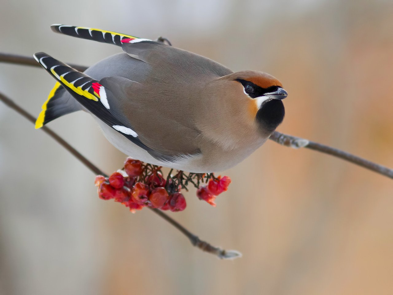 Свиристель в народе считается «красой-птицей», которая петь не умеет, а лишь стрекочет и посвистывает, издавая характерные трели — «свиририри…». Стаи свиристелей, нарядных хохлатых птиц, всегда привлекают внимание людей в городах и в сельской местности. Эти птицы с короткими ногами размером чуть меньше скворца. Их макушки украшают большие розовые хохолки. Тельце (длиной около 15 — 18 см) покрыто розовато-серым оперением. Оно буровато-серое с красным оперение, издали смотрится розовато-серым. На черных крыльях хорошо видны полоски желтой и белой окраски. Хвост, горло и полоска возле глаз черные. Хвост окантовывает желтая полоса, крылья украшает узкая белая полоска. Вблизи можно рассмотреть красные кончики маховых перьев.