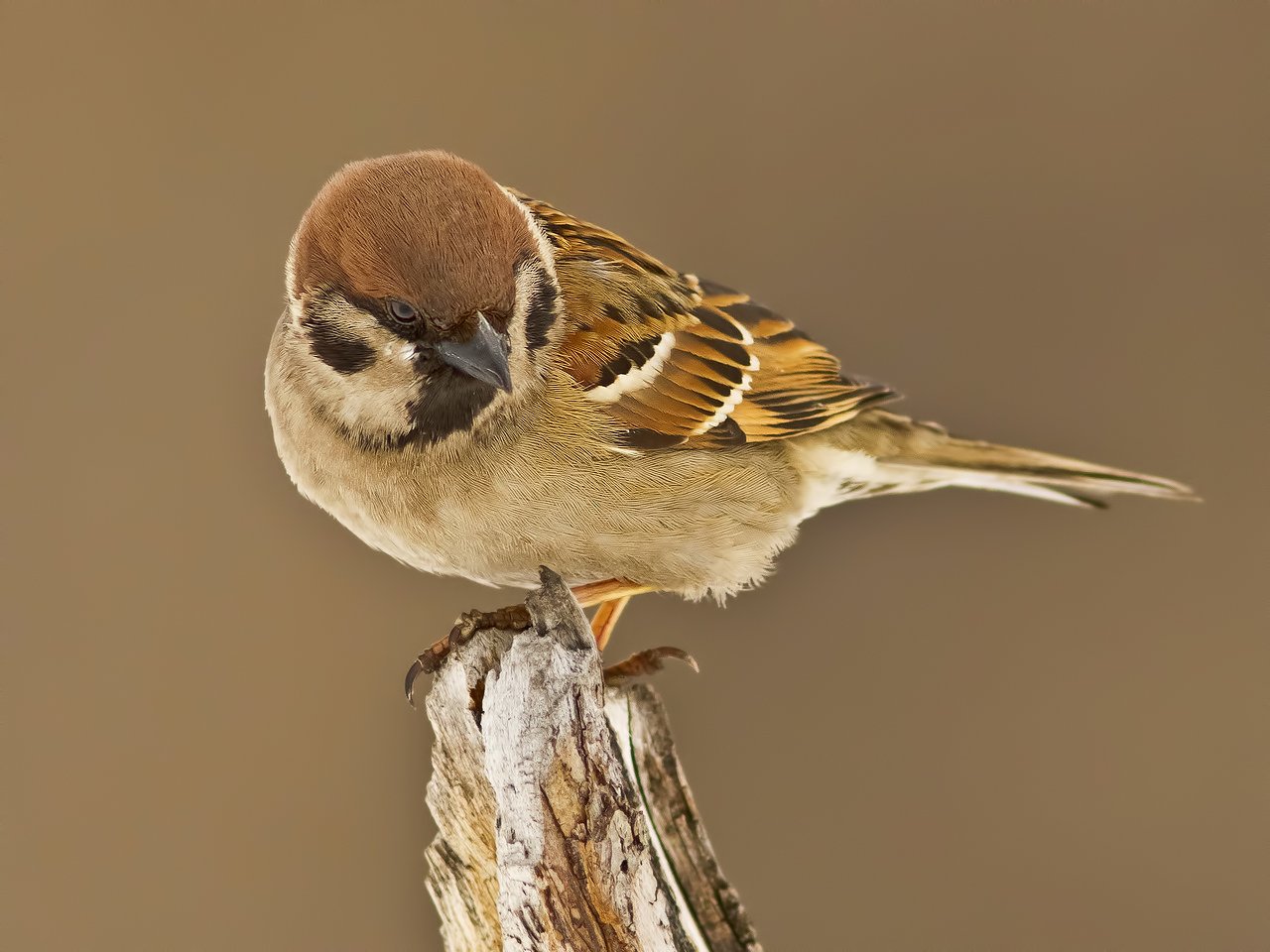 Полевой воробей[(лат. Passer montanus) — широко распространённая птица семейства воробьиных, близкий родственник обитателя городов домового воробья. В отличие от последнего, в меньшей степени зависим от человека. Встречается на окраинах населённых пунктов, в заброшенных селениях и вблизи от посевов зерновых культур, садов и виноградников. В дикой природе распространён в светлых лесах, кустарниковых зарослях и степи. Несколько мельче домового воробья, отличается от него в первую очередь коричневой шапочкой на голове, отчётливыми чёрными пятнами на белых щеках, значительно меньшим по размеру чёрным «нагрудником» на горле и воротничком белых перьев по бокам шеи
