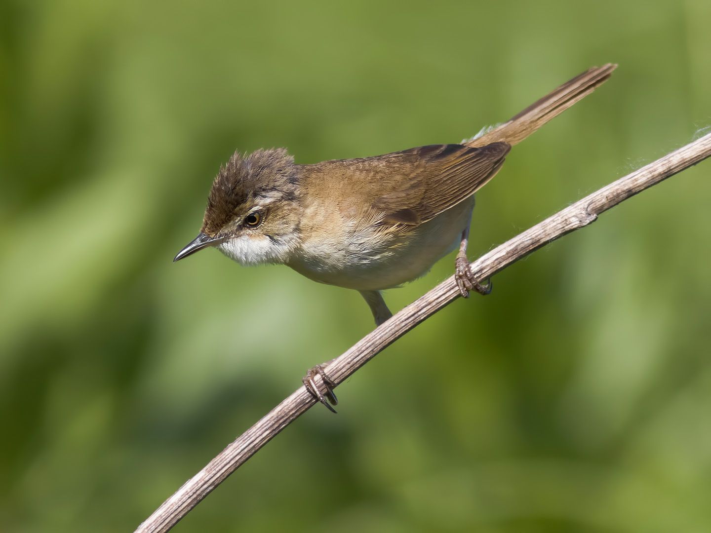 Индийская камышевка немного меньше садовой камышевки, с более компактным телосложением, более округлой головой, но сравнительно длинным хвостом. Верх рыжевато-бурый, без темных пестрин и полос, поясница и надхвостье явно рыжее спины. Шапочка тоже без резких пестрин, но, в отличие от тростниковой, садовой и болотной камышевок, немного темнее спины, особенно по бокам темени. Бровь белая или беловатая, широкая и длинная, далеко заходит за глаз, окологлазное кольцо выражено слабо.