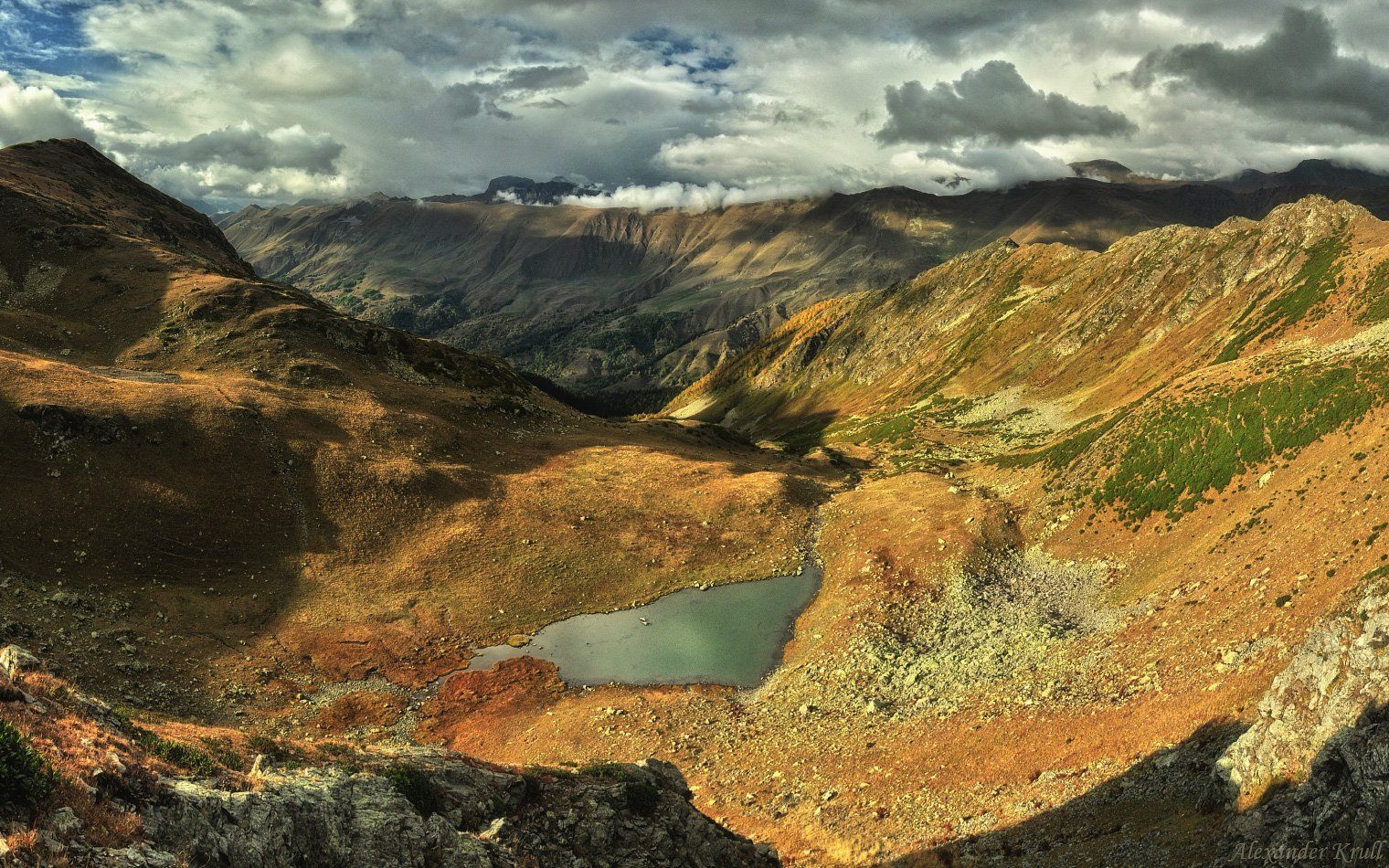 Карачаево-Черкессия, маленькое озерцо в группе озёр (Семиозерье) на северной оконечности хребта Аркасара. Впереди - хребет Абишира-Ахуба и виднеющаяся из-за него гора Загедан-Скала.