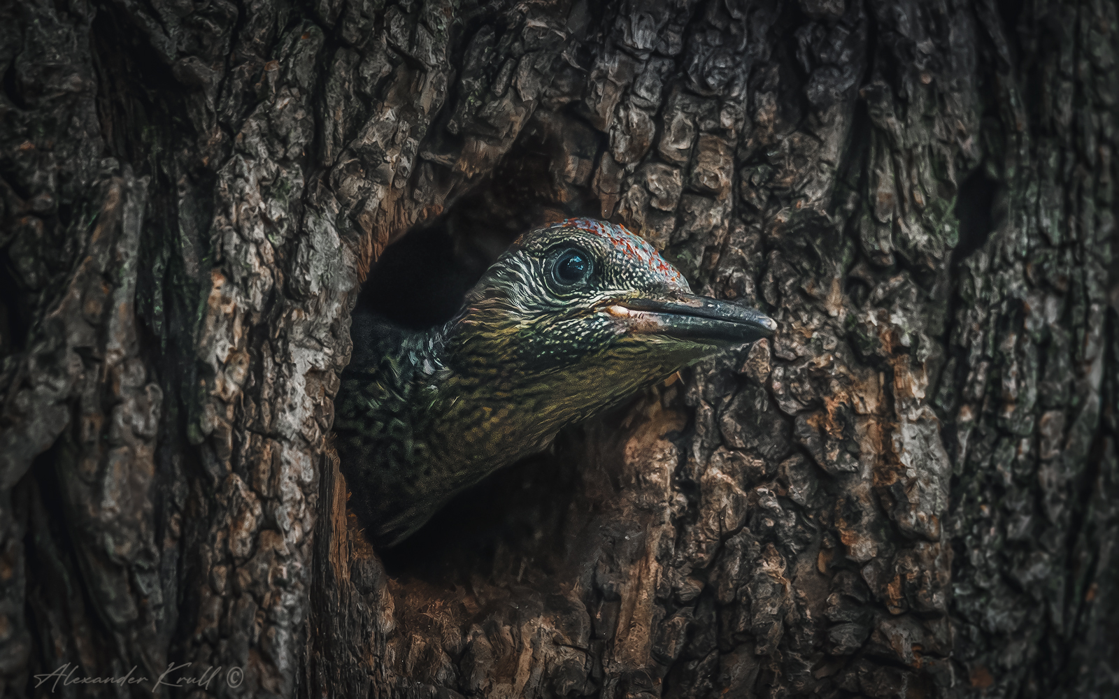 За спиной родное и уютное гнездо в дупле старого дерева, впереди - большой и незнакомый мир. Со дня на день для этого, уже подросшего для решающего шага, птенца зеленого дятла начнется новый этап в его юной жизни, он покинет место своего появления на свет. А пока все его заботы - выглядывать из дупла и ожидать родителей с очередной порцией вкусняшек.